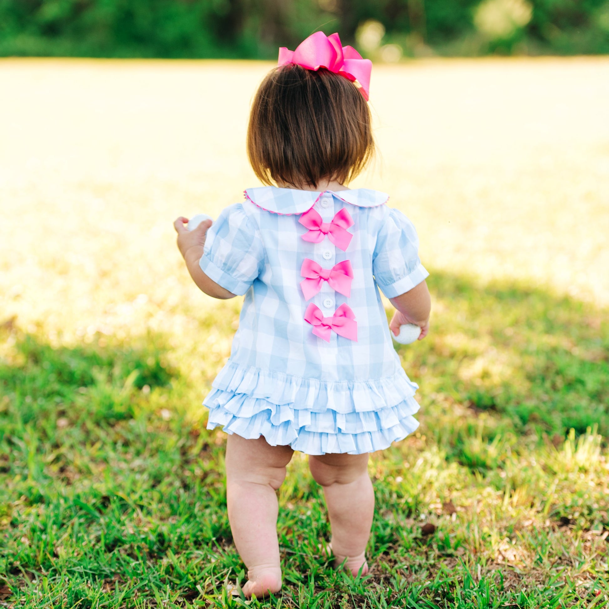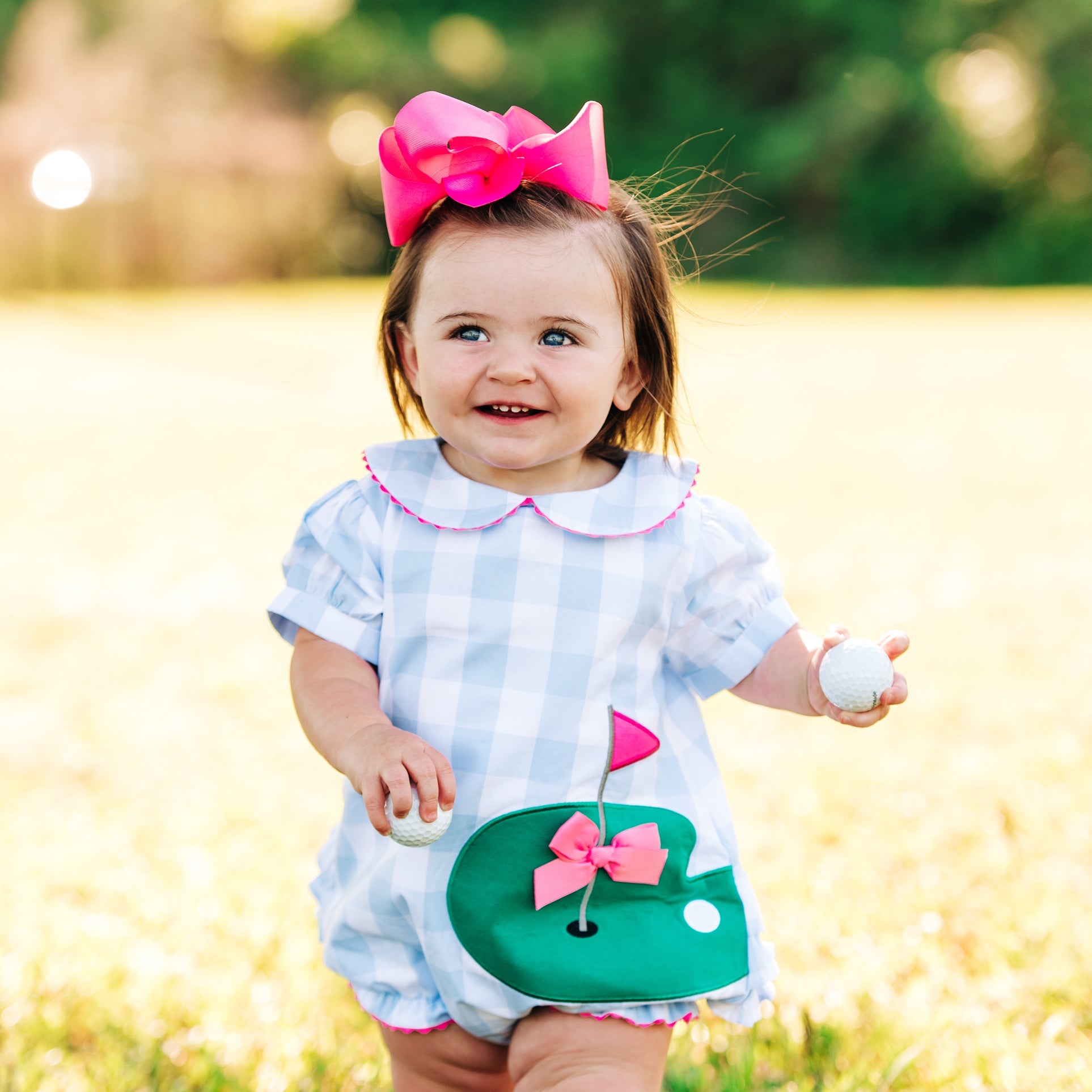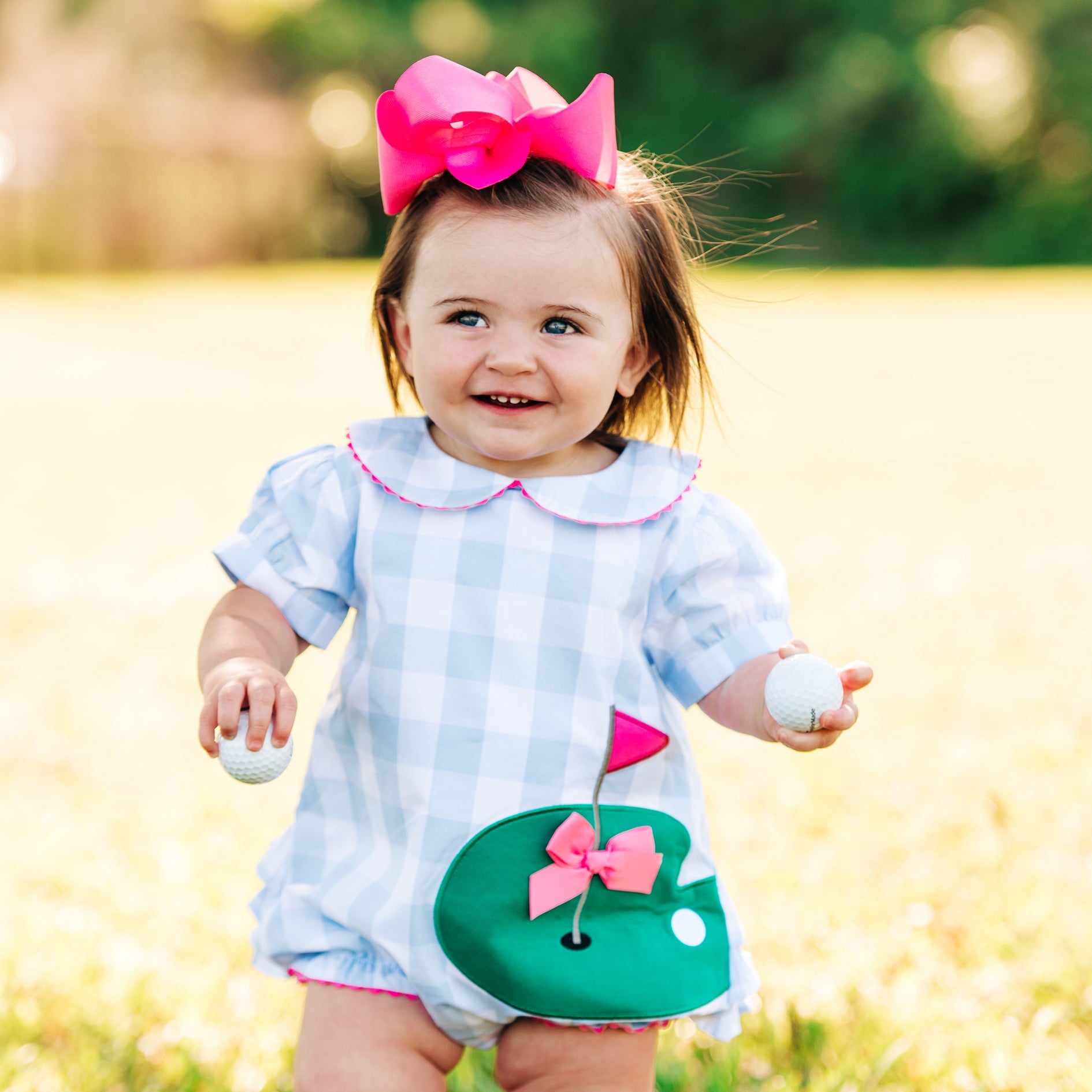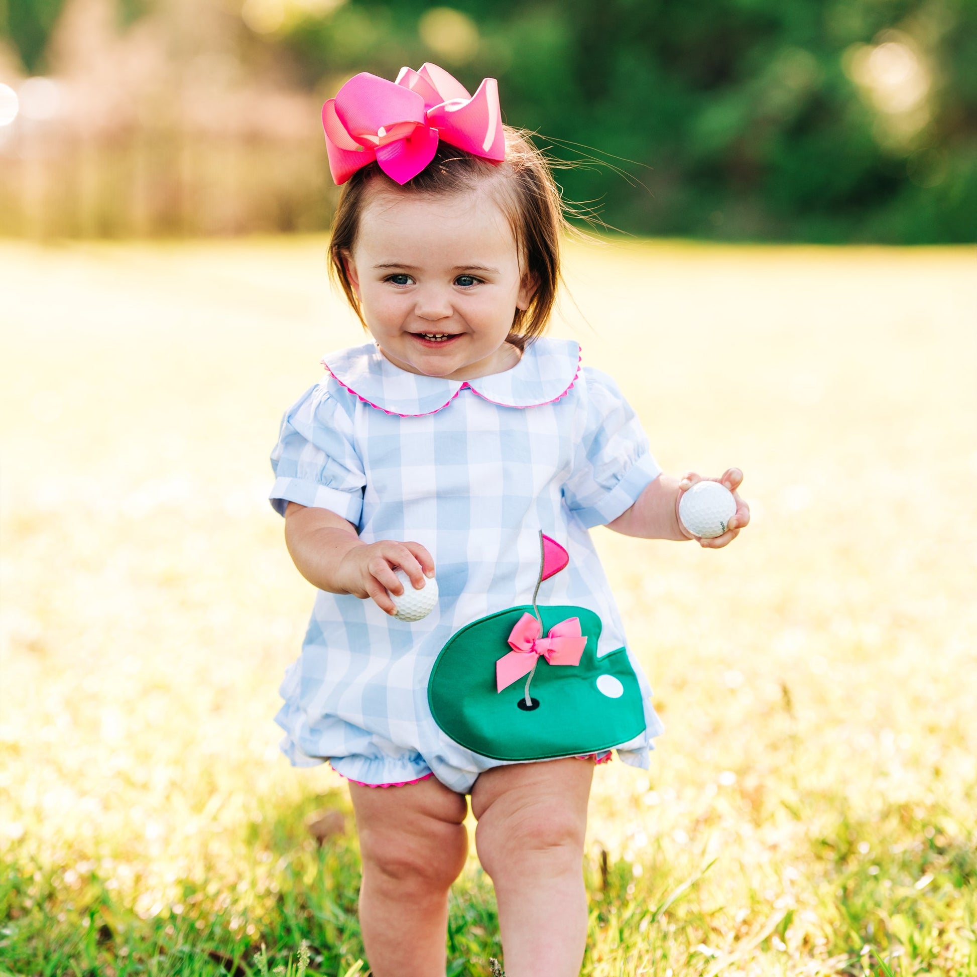 Our Birdie Blue Golf Bubble was made to hit the greens in style. Bubble features an adorable golf green applique with real grosgrain bow, ruffled bum and ric rac trimmed collar.