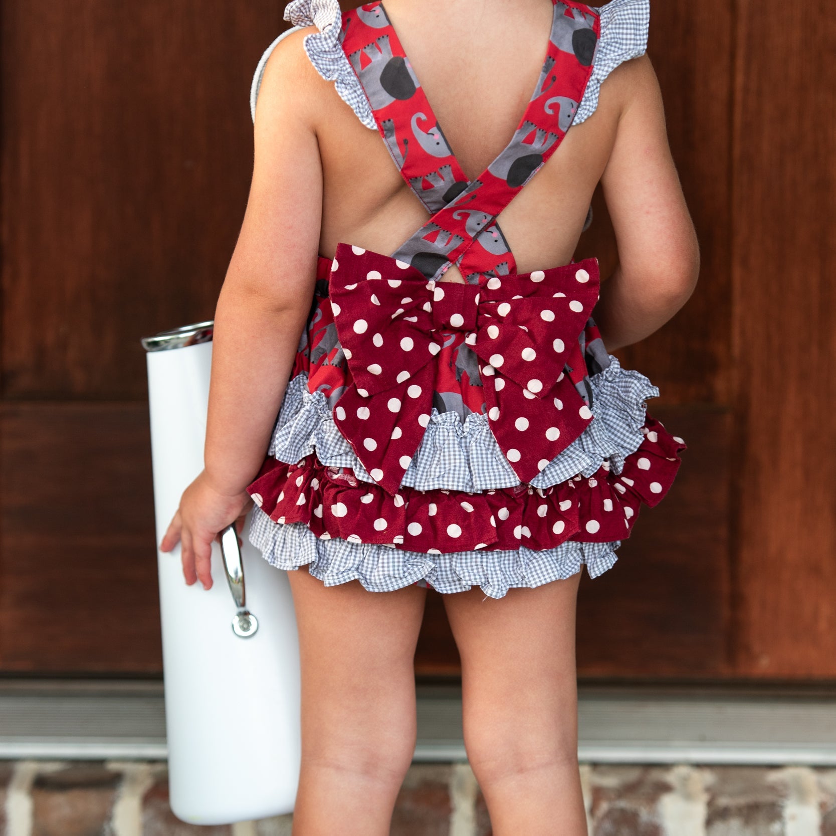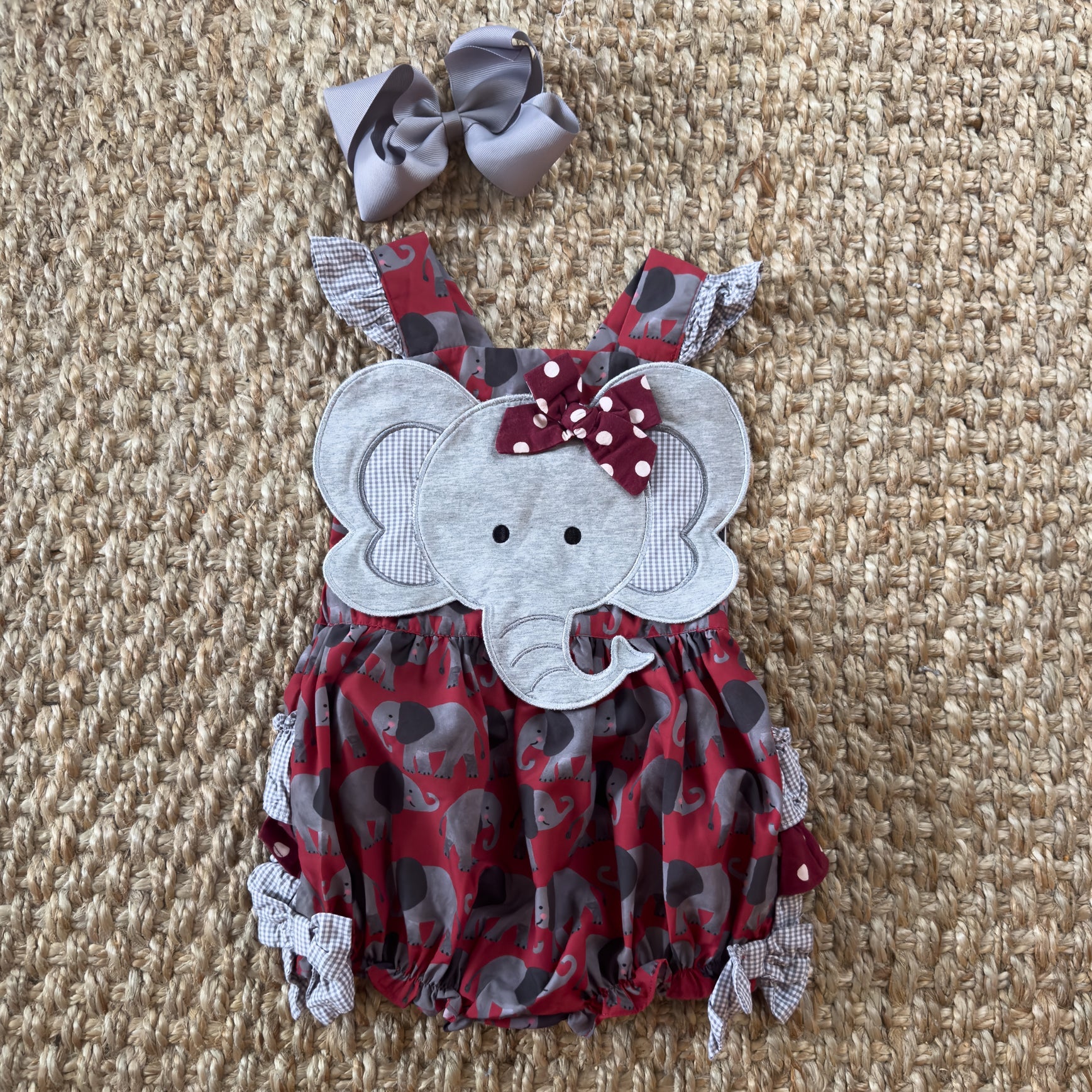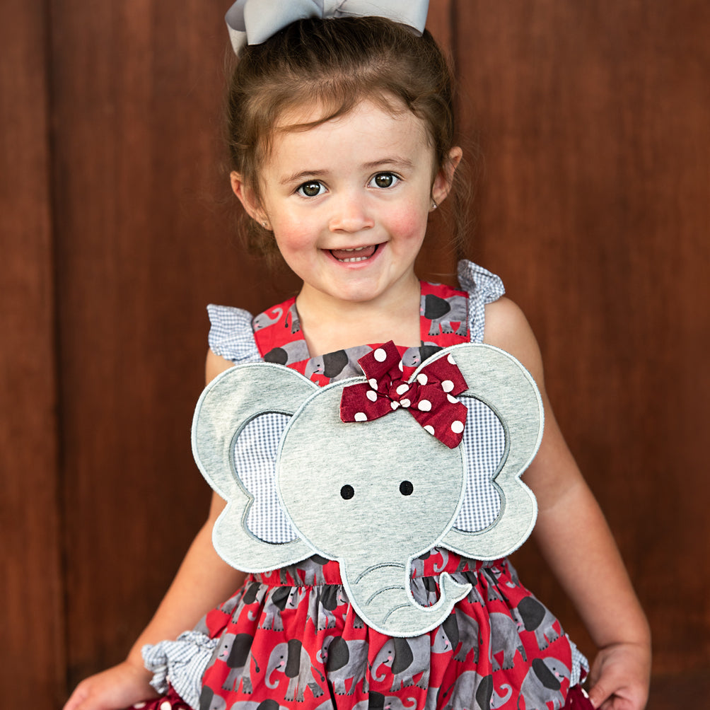 Be GameDay ready for Saturdays in the South with our Crimson Elephant Bubble. This bubble features our custom designed Elephant GameDay print by the talented Katherine Herrell Studio. Adjustable criss-cross straps button in the back.