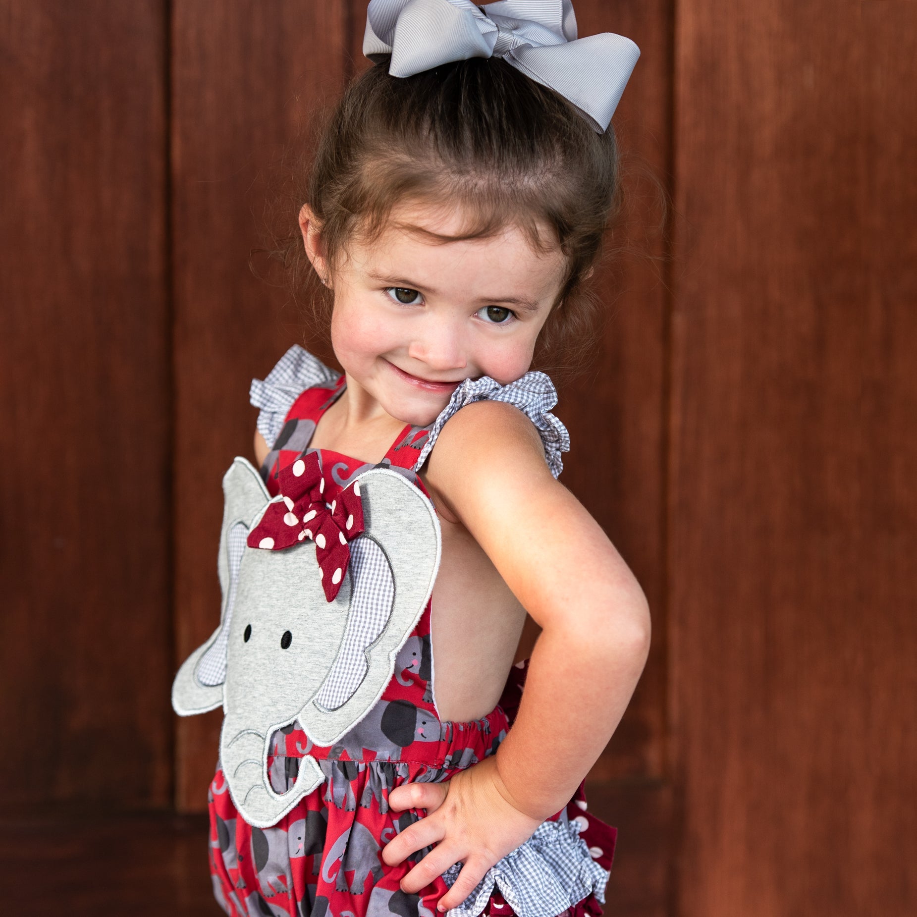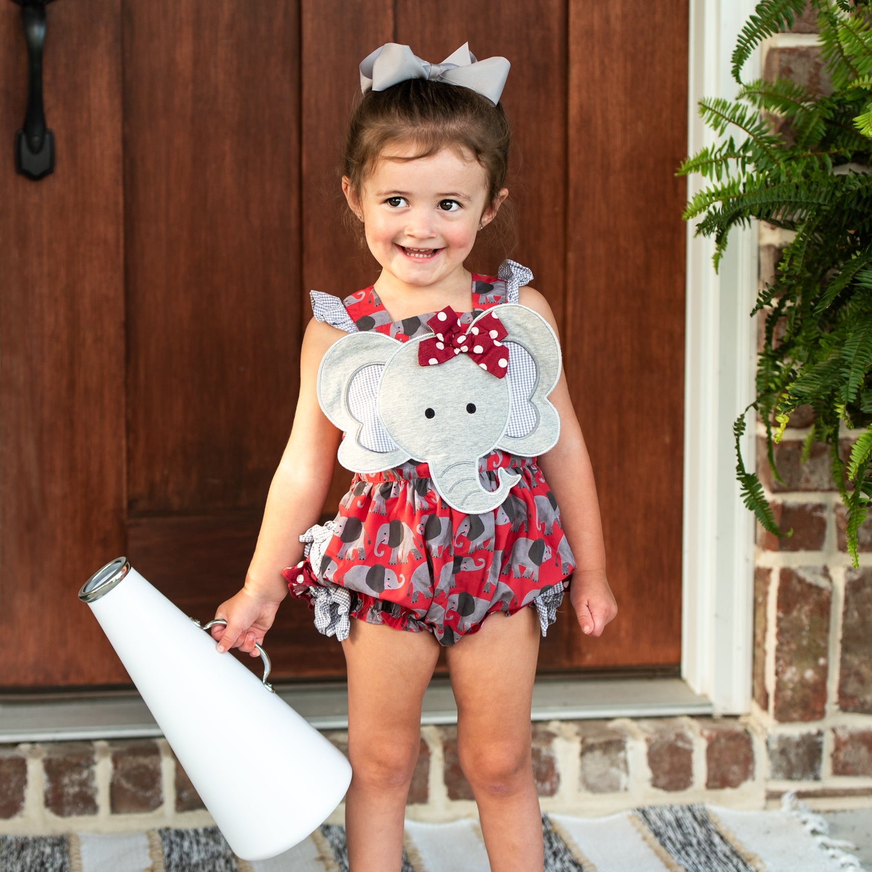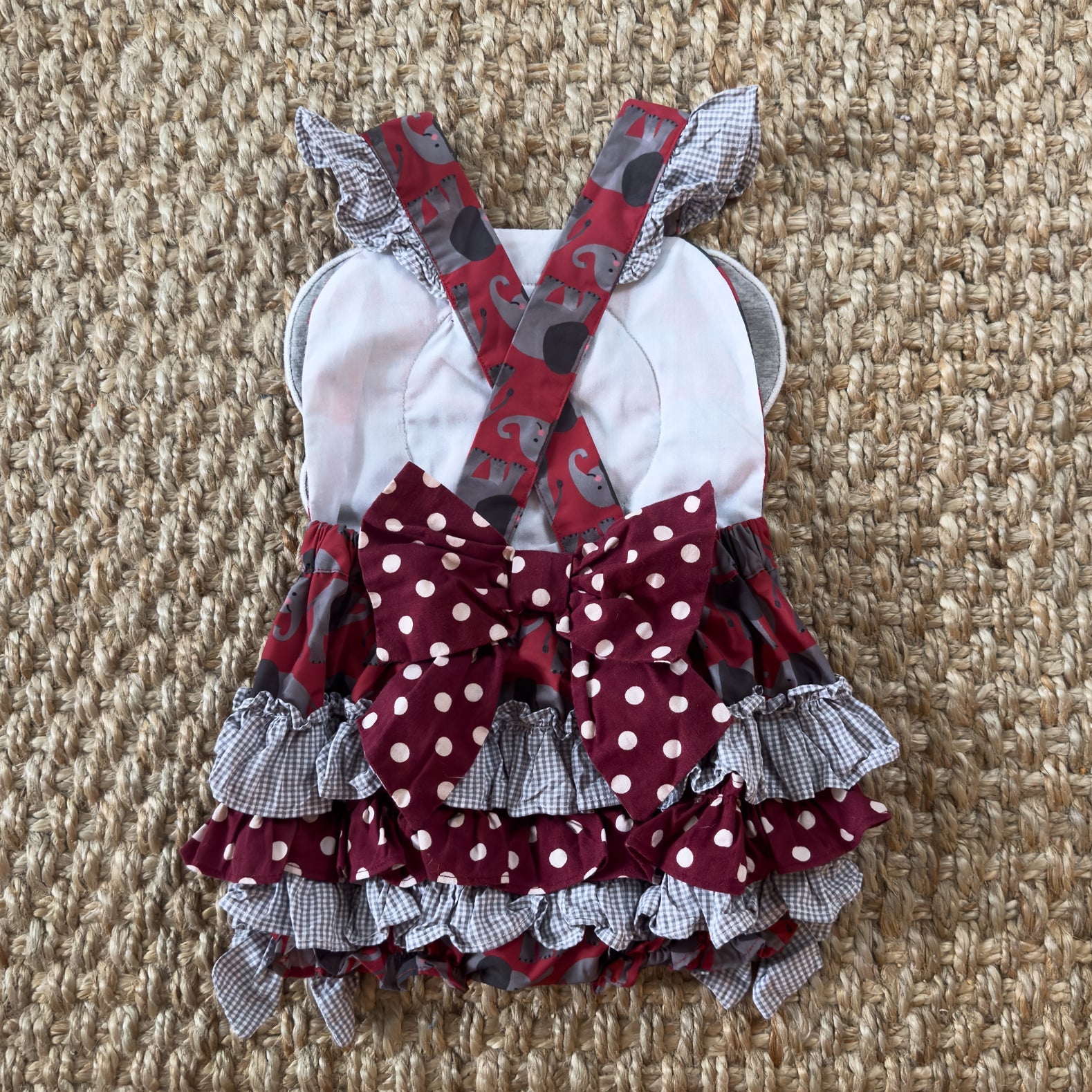 Be GameDay ready for Saturdays in the South with our Crimson Elephant Bubble. This bubble features our custom designed Elephant GameDay print by the talented Katherine Herrell Studio. Adjustable criss-cross straps button in the back.