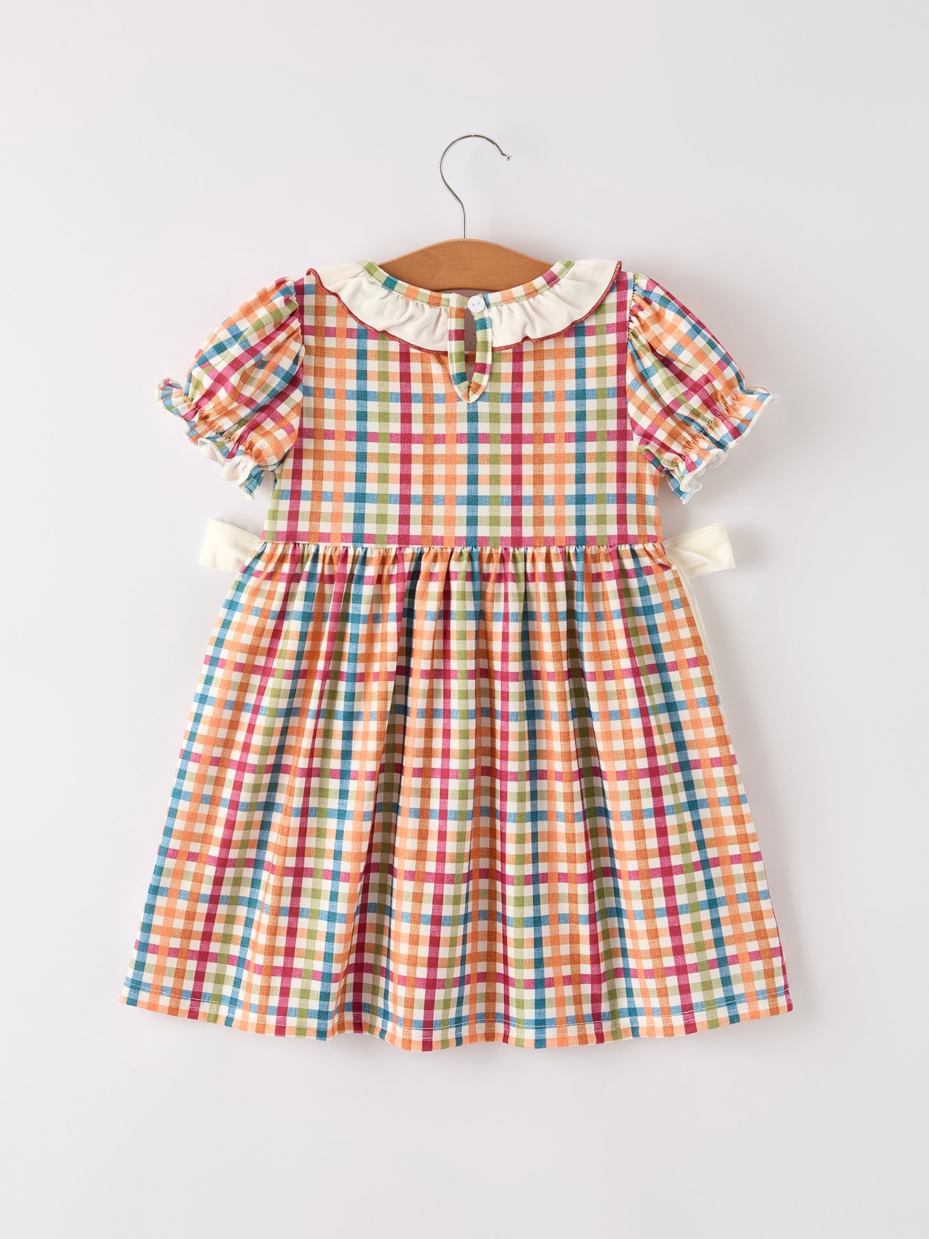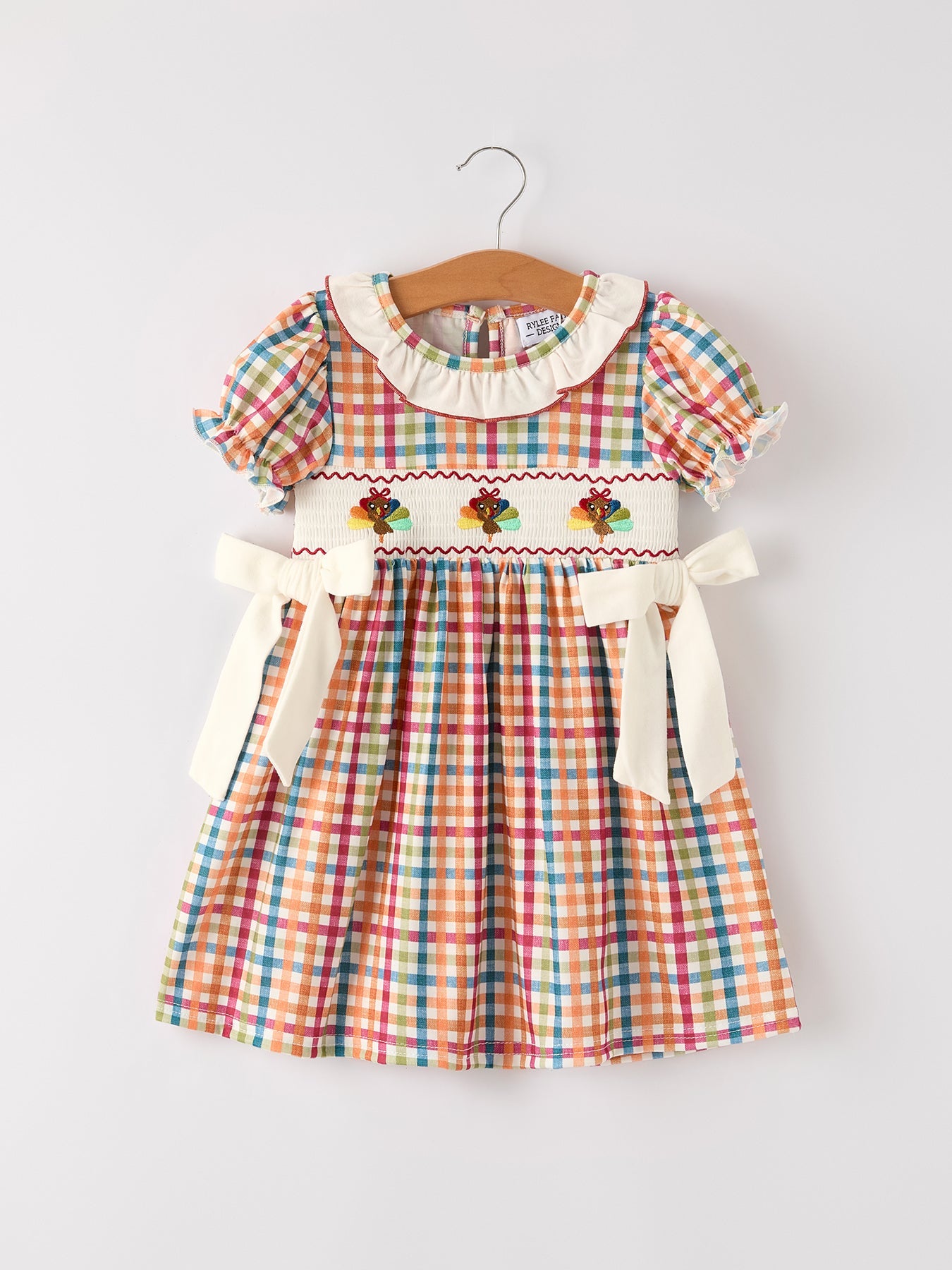 Fall Thanksgiving Color Plaid Chick Embroidery Smocking Girls Dress