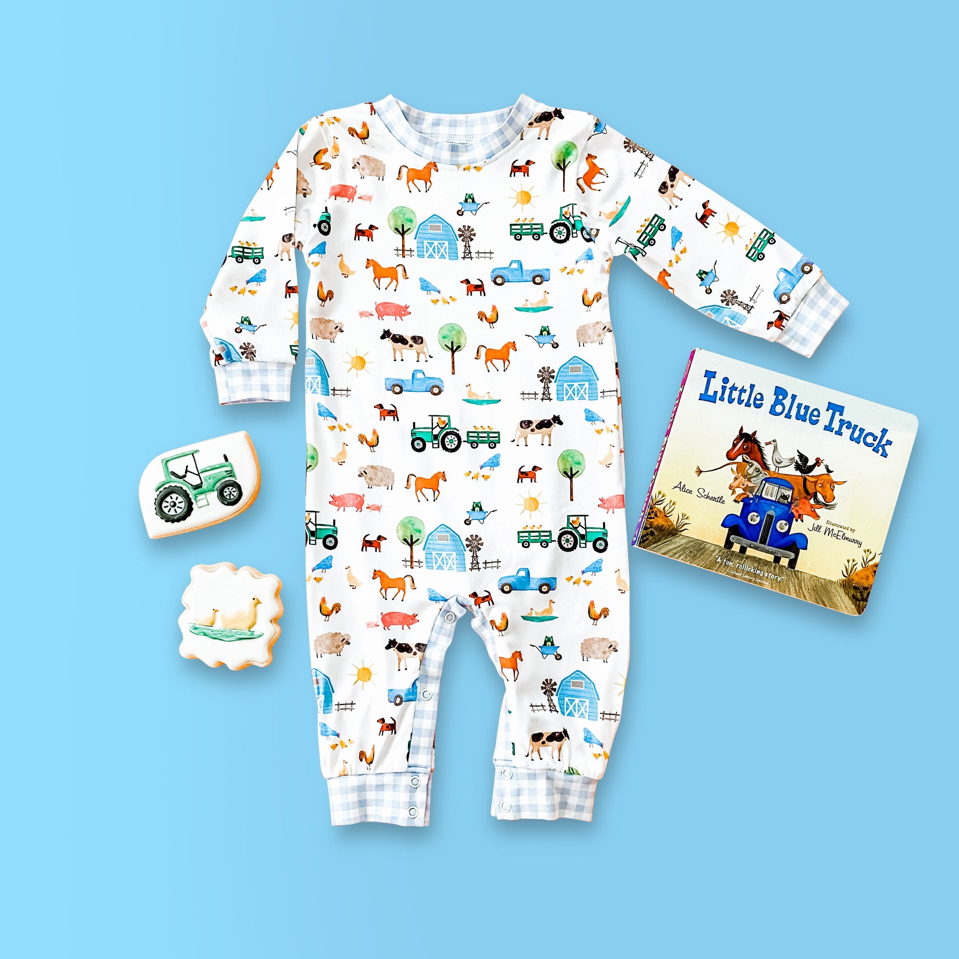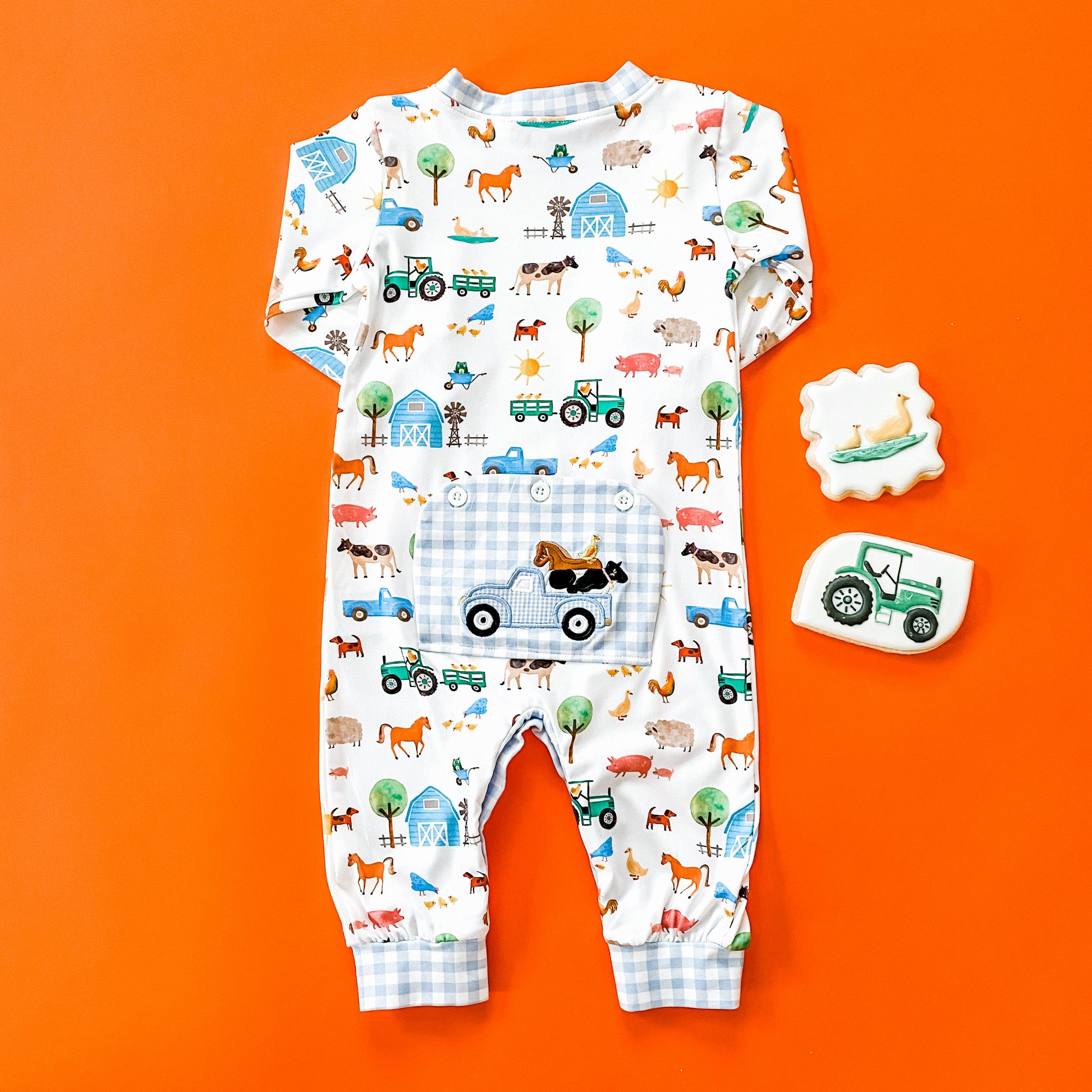 The Farm Truck Romper is a super soft and cozy with a fun custom Barnyard & Bows print designed by Katherine Herrell Studio. Our Romper features a pop of blue gingham and a little blue farm truck applique on the bum. We love to pair this romper with our favorite cowboy boots for a fun day at the farm!