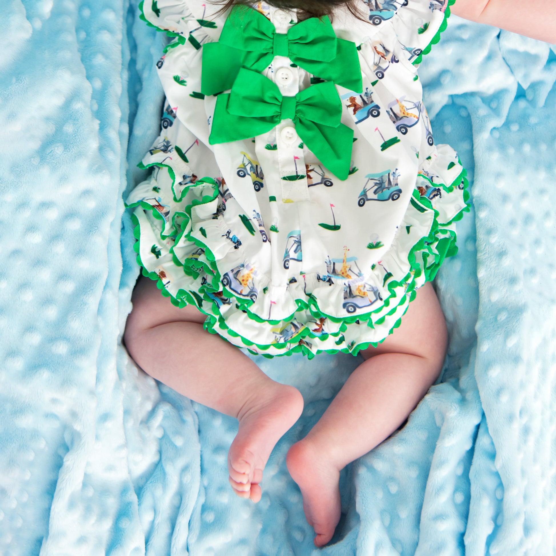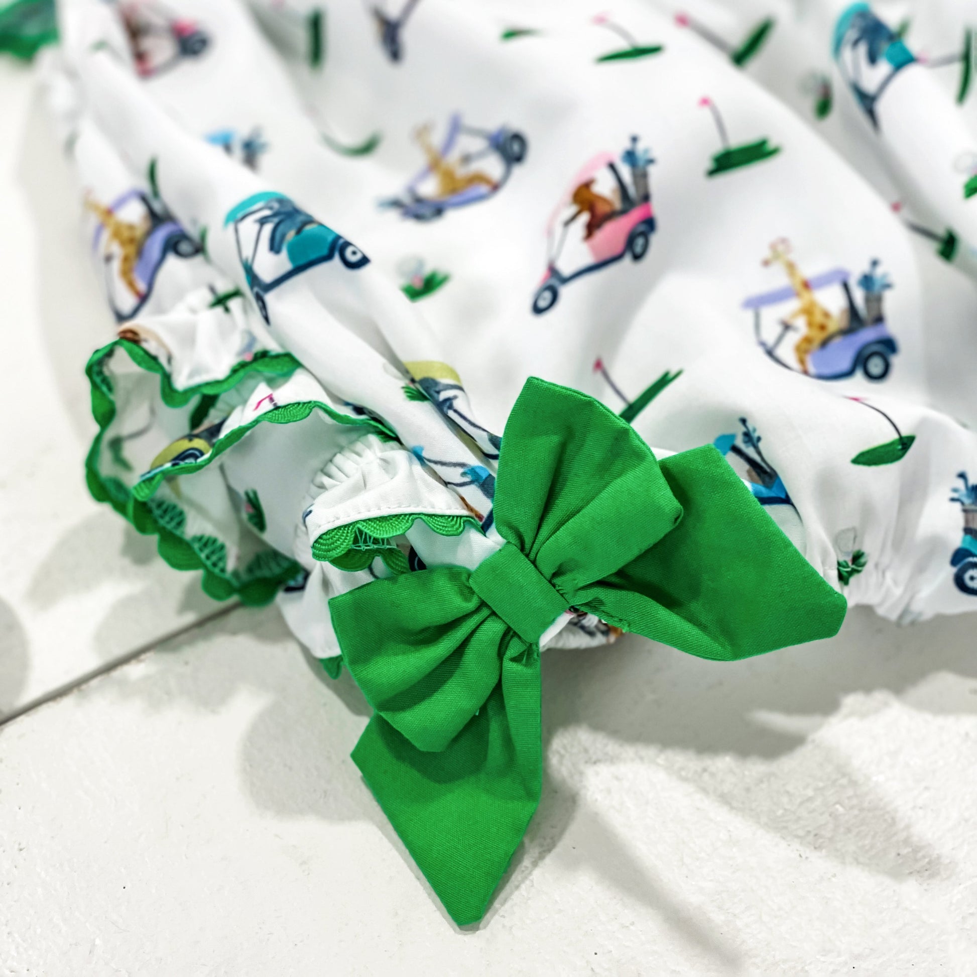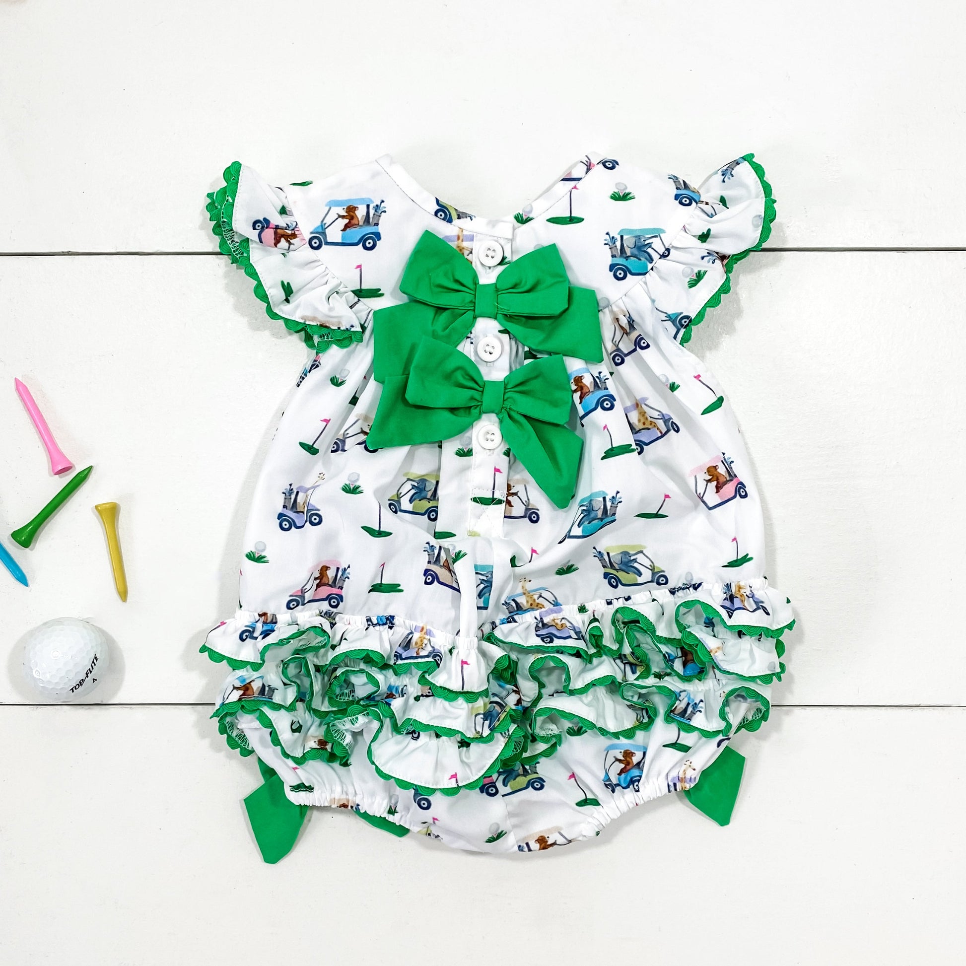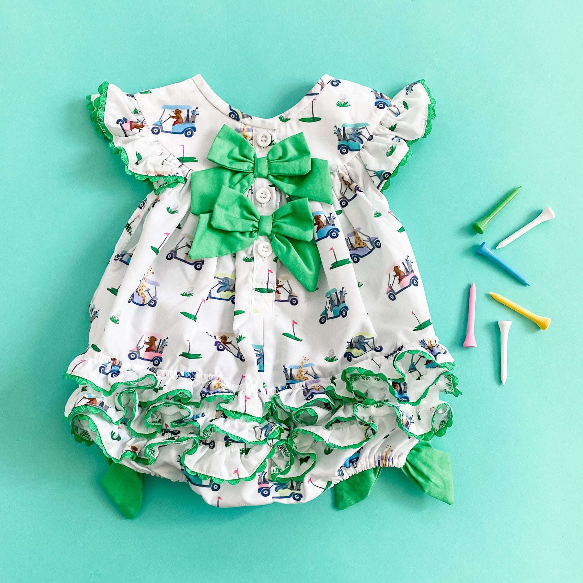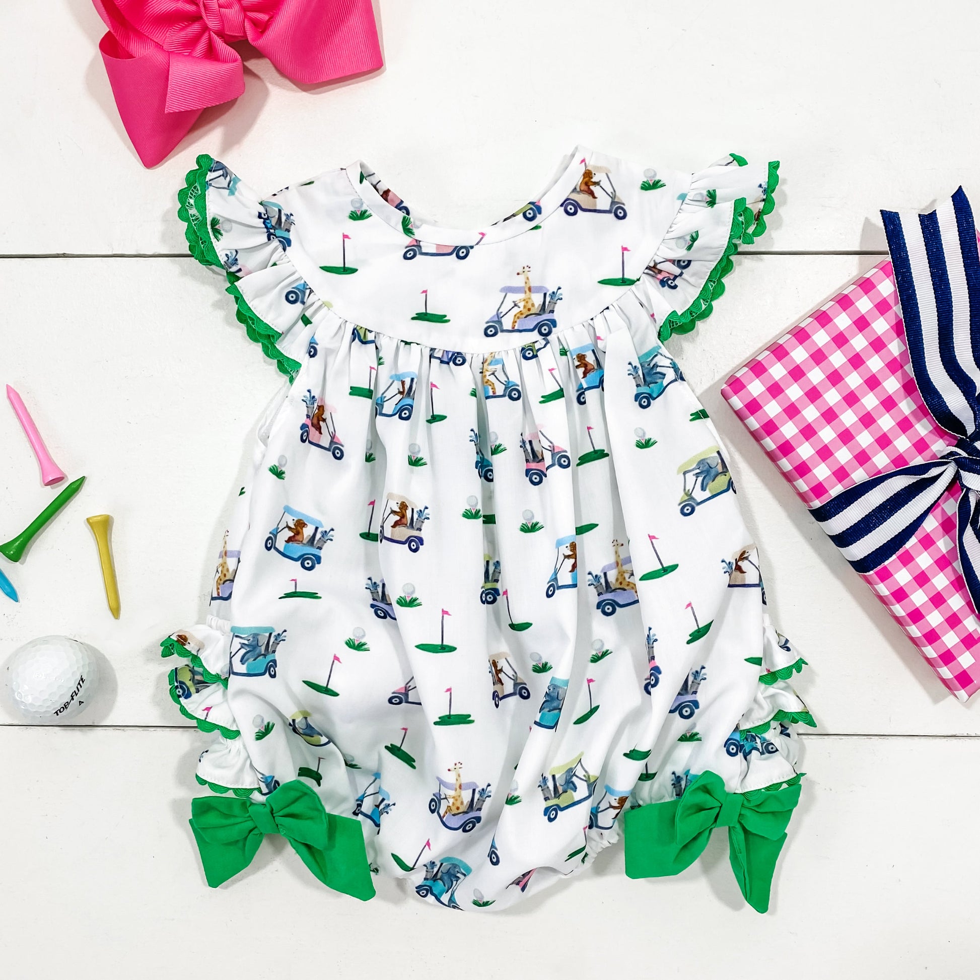 Our Best Selling Fairway Dress is now available as a bubble! This bubble features our beautiful custom designed Fairway Golf print by the talented Katherine Herrell Studio, as well as oodles of ruffles, ric rac and bows!