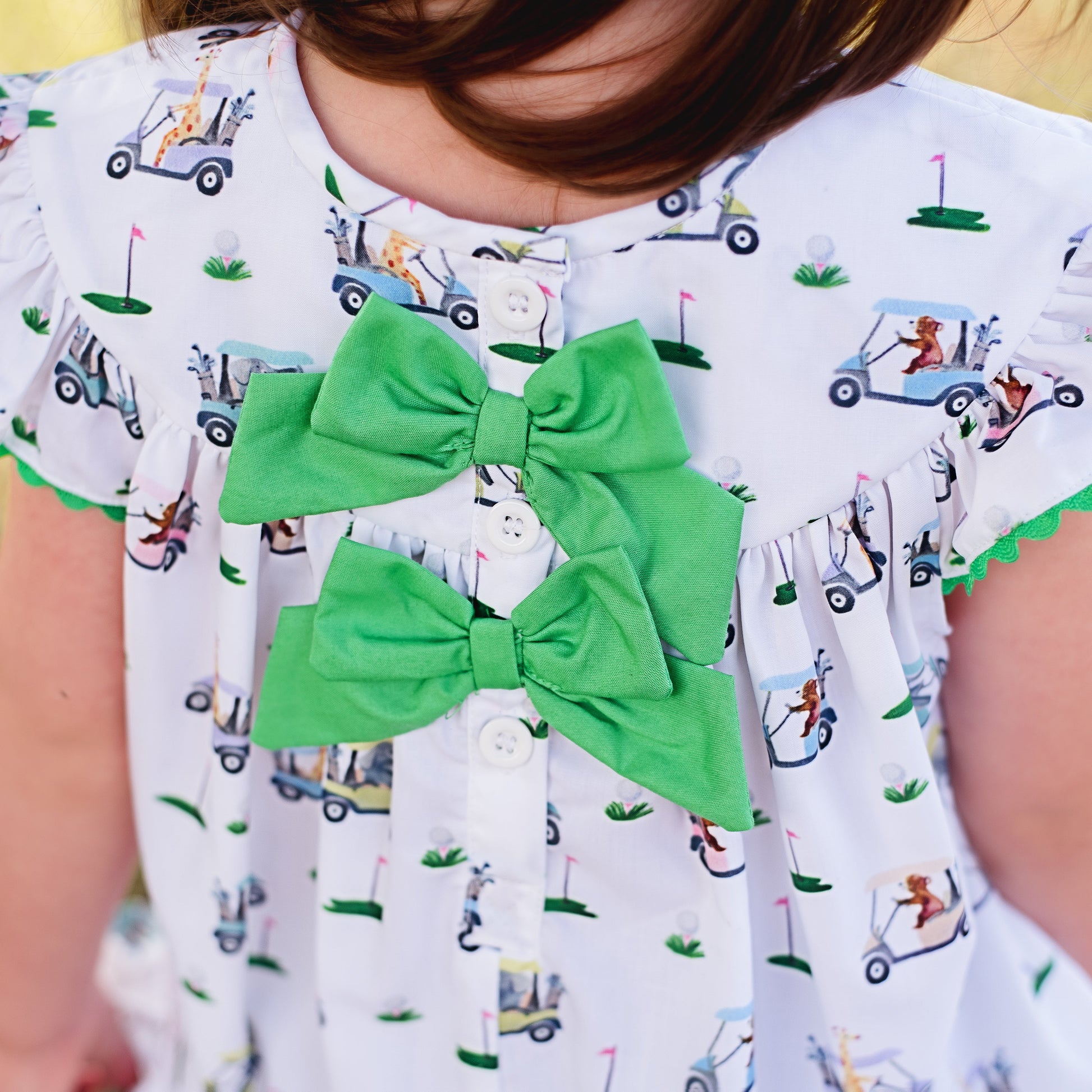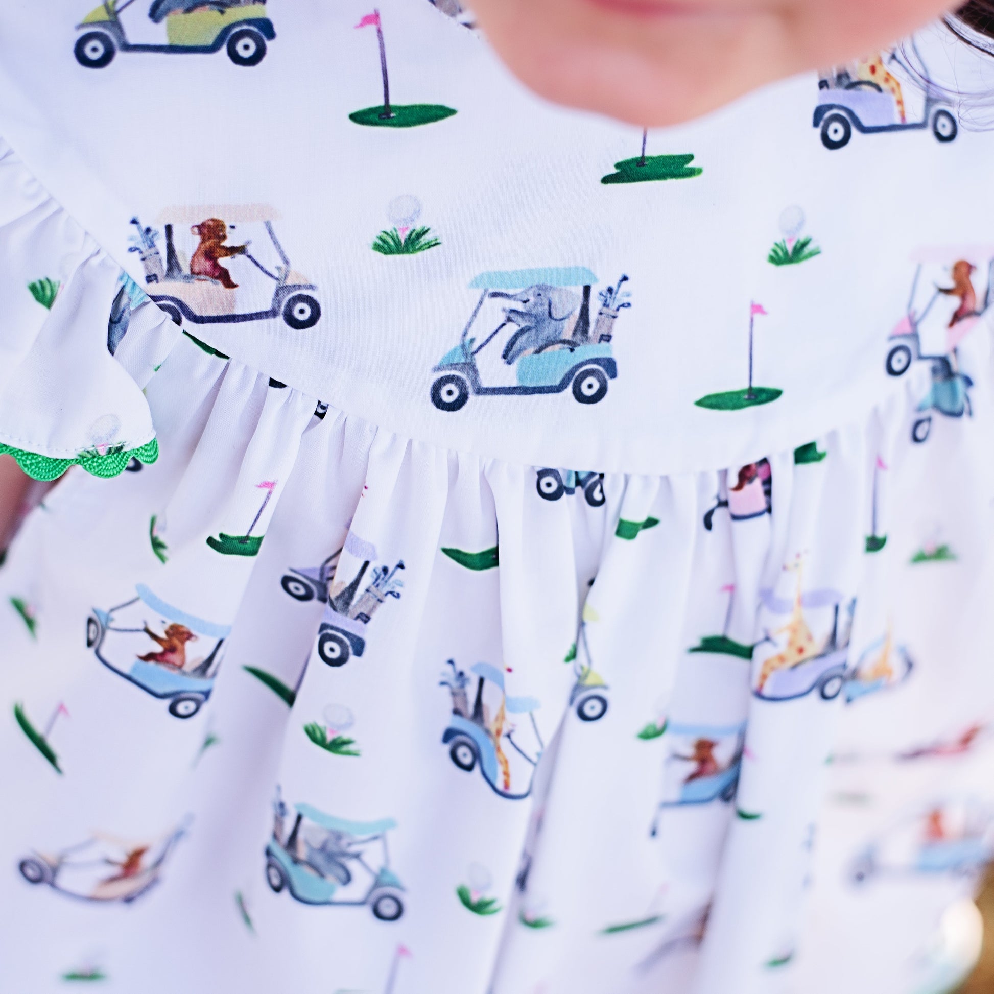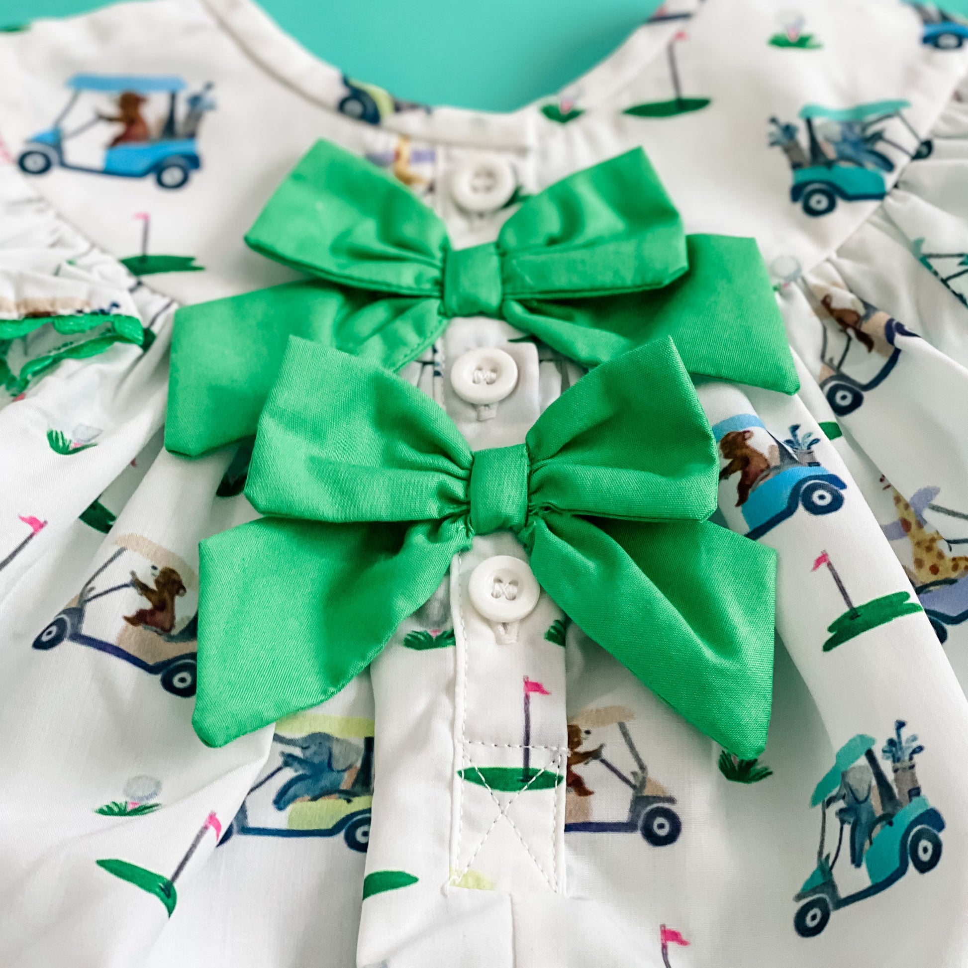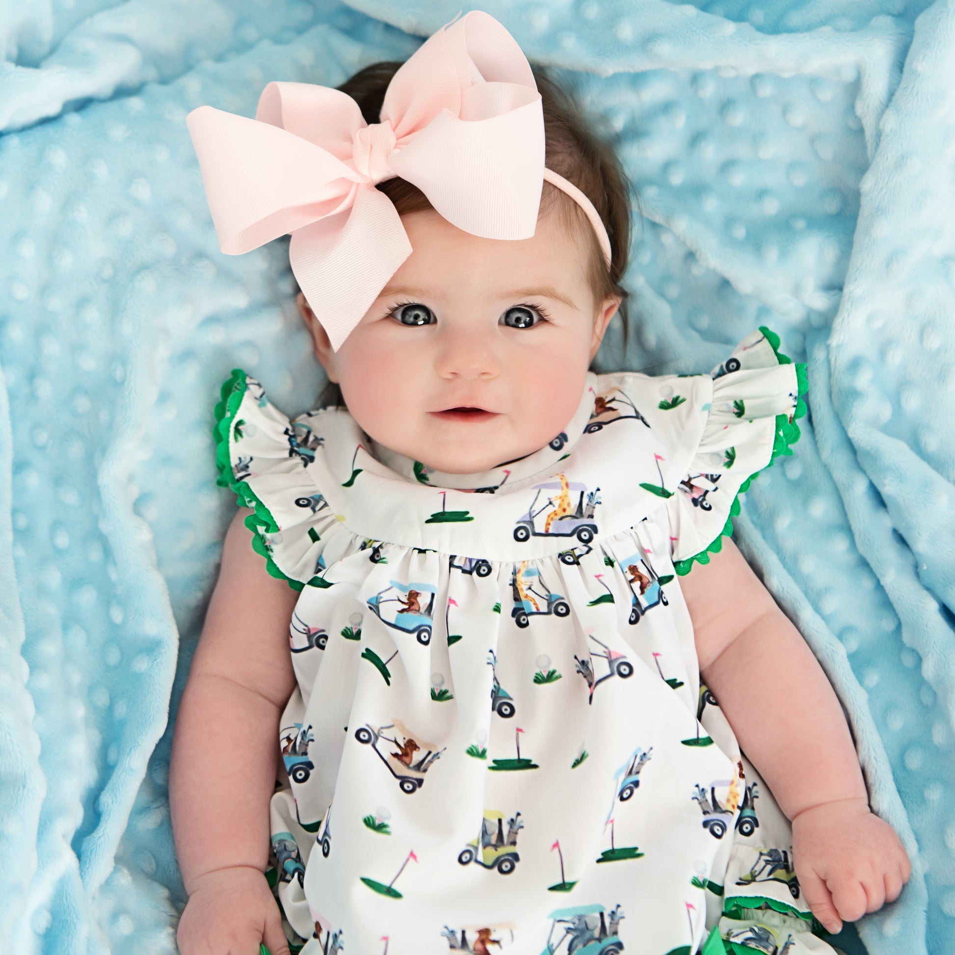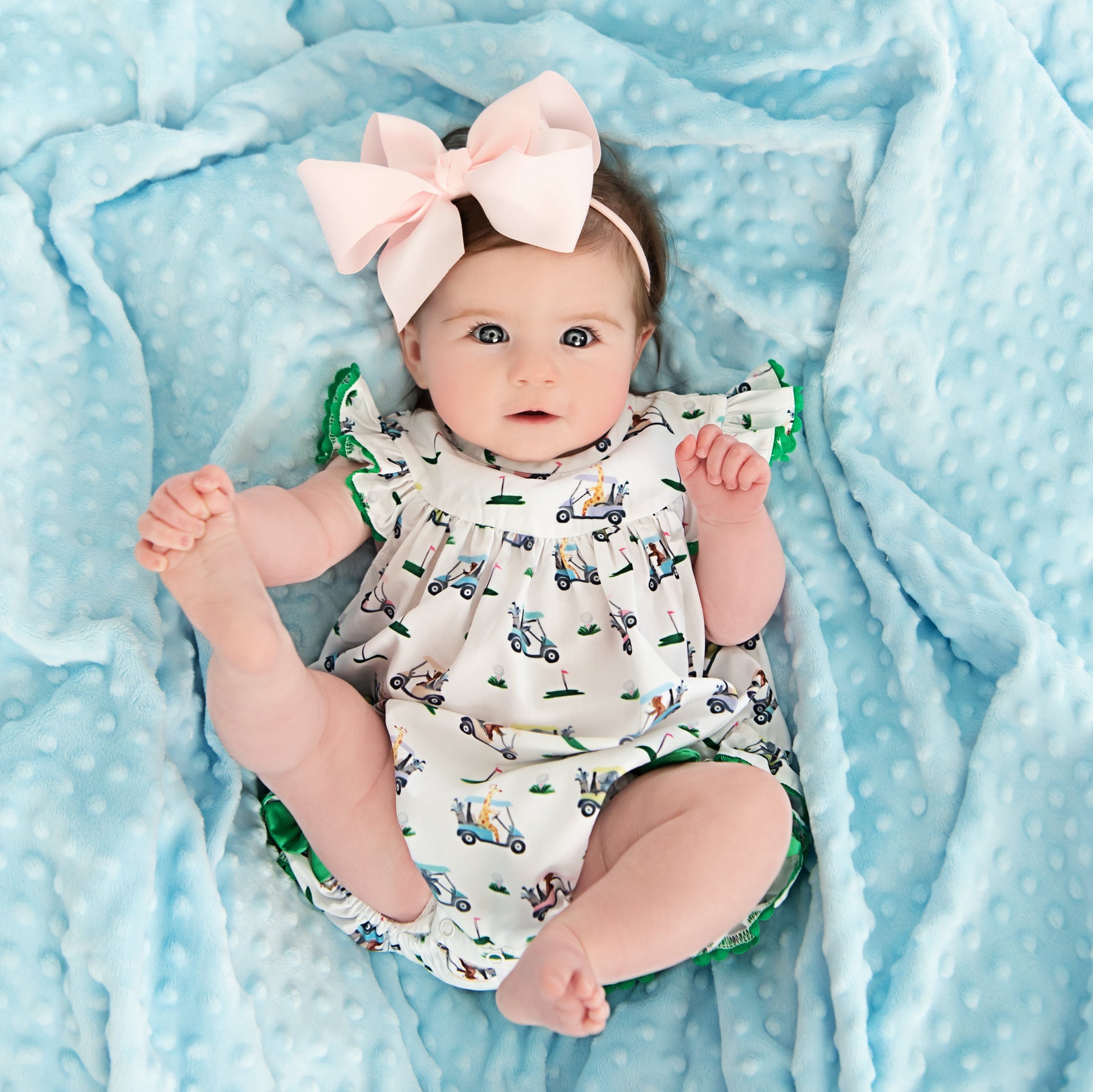 Our Best Selling Fairway Dress is now available as a bubble! This bubble features our beautiful custom designed Fairway Golf print by the talented Katherine Herrell Studio, as well as oodles of ruffles, ric rac and bows!