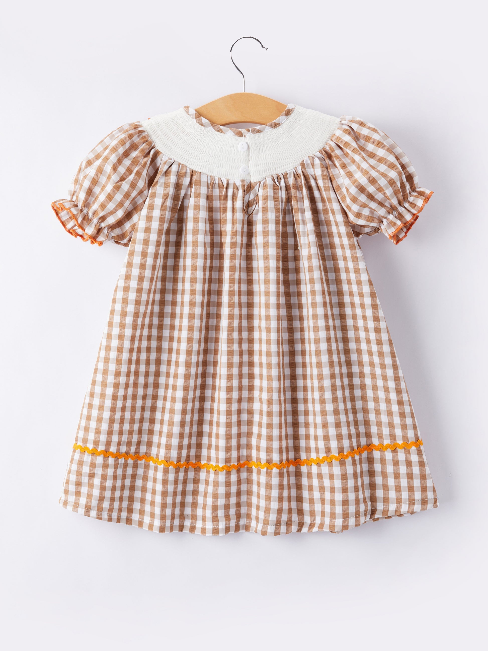 Celebrate the season with our Girls Thanksgiving Dress, complete with hand-smocked embroidery on a beautiful brown plaid fabric. Perfect for family gatherings or special occasions, this dress will make your little one stand out and feel extra special. Add a touch of tradition and charm to your holiday wardrobe.