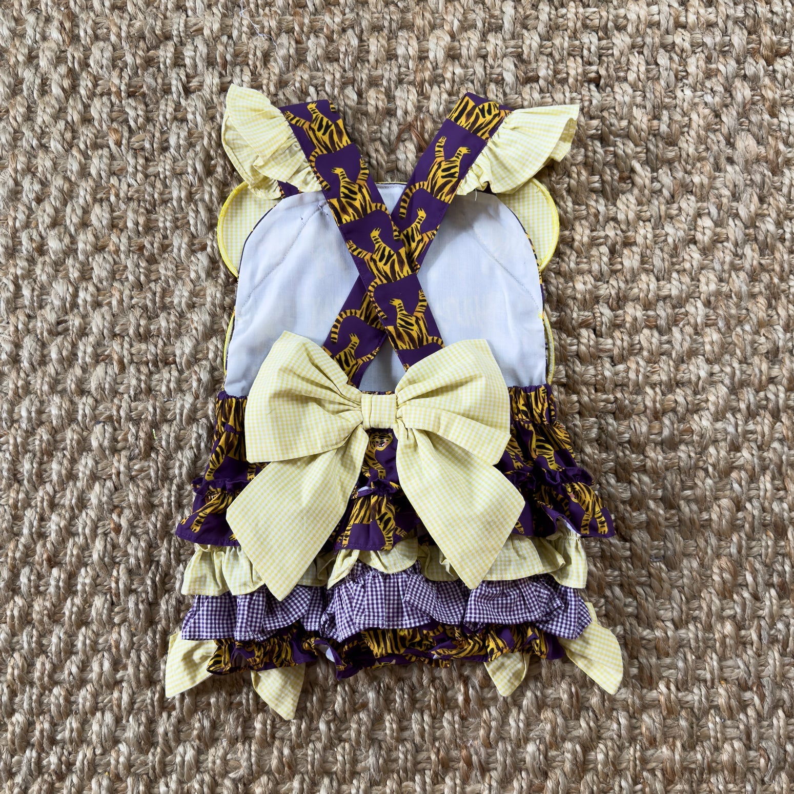 Be GameDay ready for Saturdays in the South with our Gold & Purple Tiger Bubble. This bubble features our custom designed Tiger GameDay print by the talented Katherine Herrell Studio. Adjustable criss-cross straps button in the back.