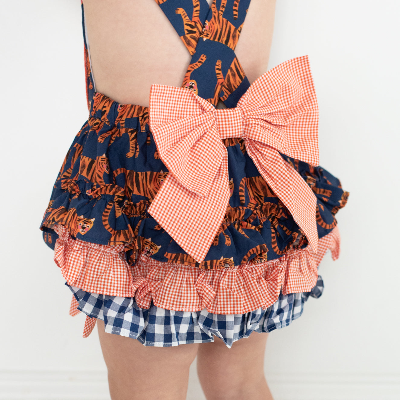 Be GameDay ready for Saturdays in the South with our Navy Tiger Bubble. This bubble features our custom designed Tiger GameDay print by the talented Katherine Herrell Studio. Adjustable criss-cross straps button in the back.