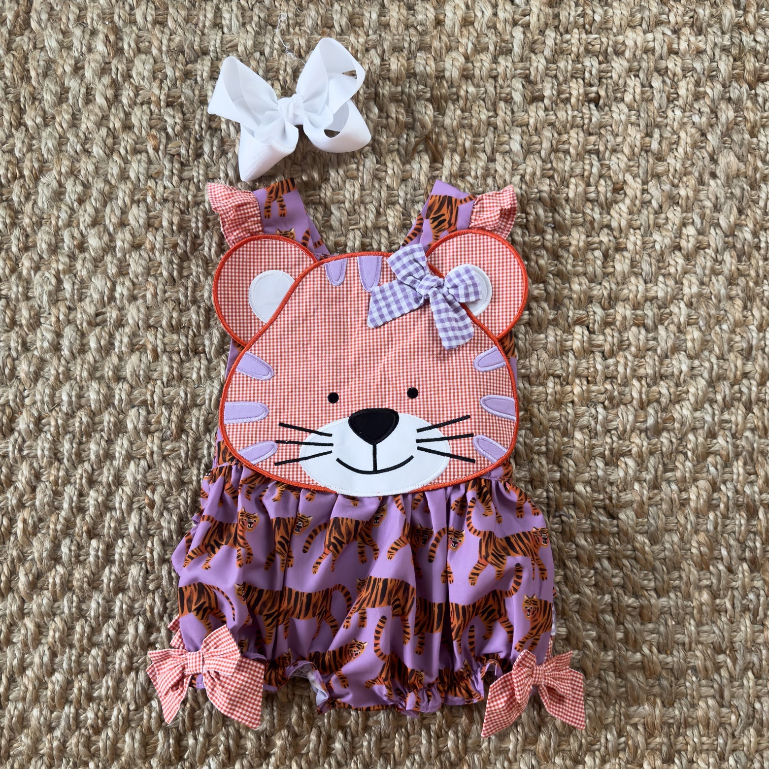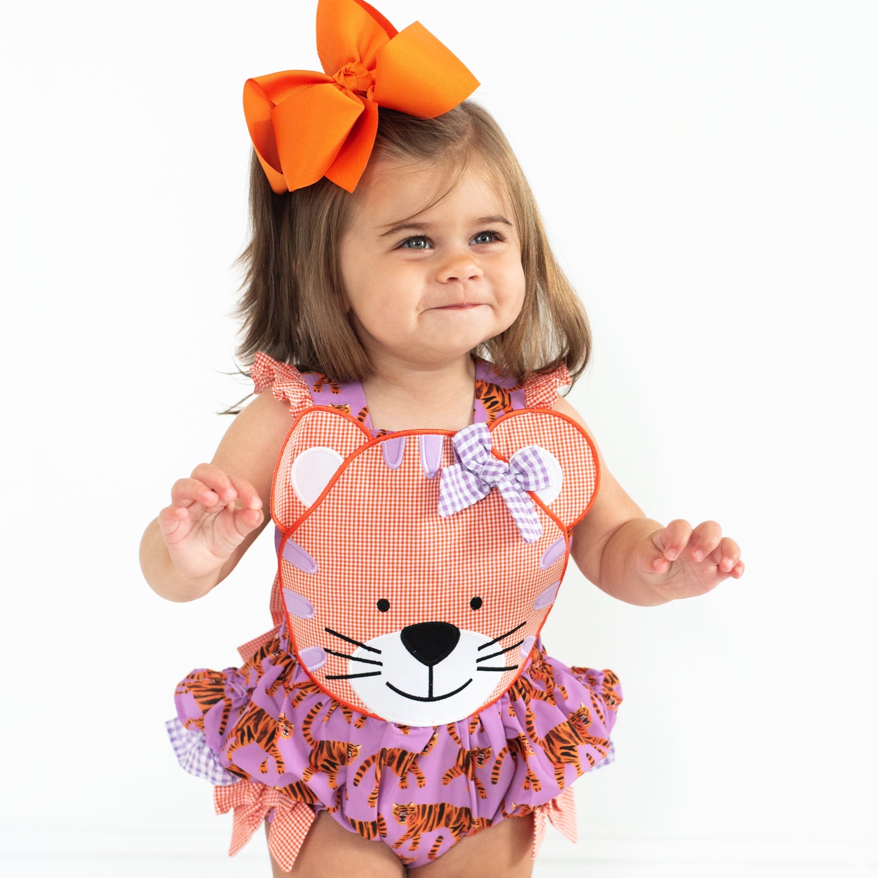Be GameDay ready for Saturdays in the South with our Orange & Purple Tiger Bubble. This bubble features our custom designed Tiger GameDay print by the talented Katherine Herrell Studio. Adjustable criss-cross straps button in the back.