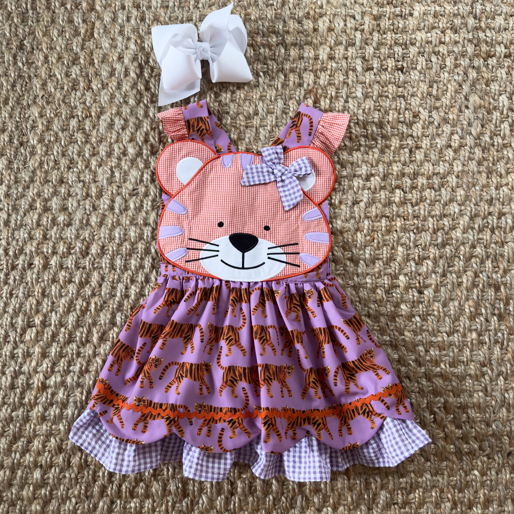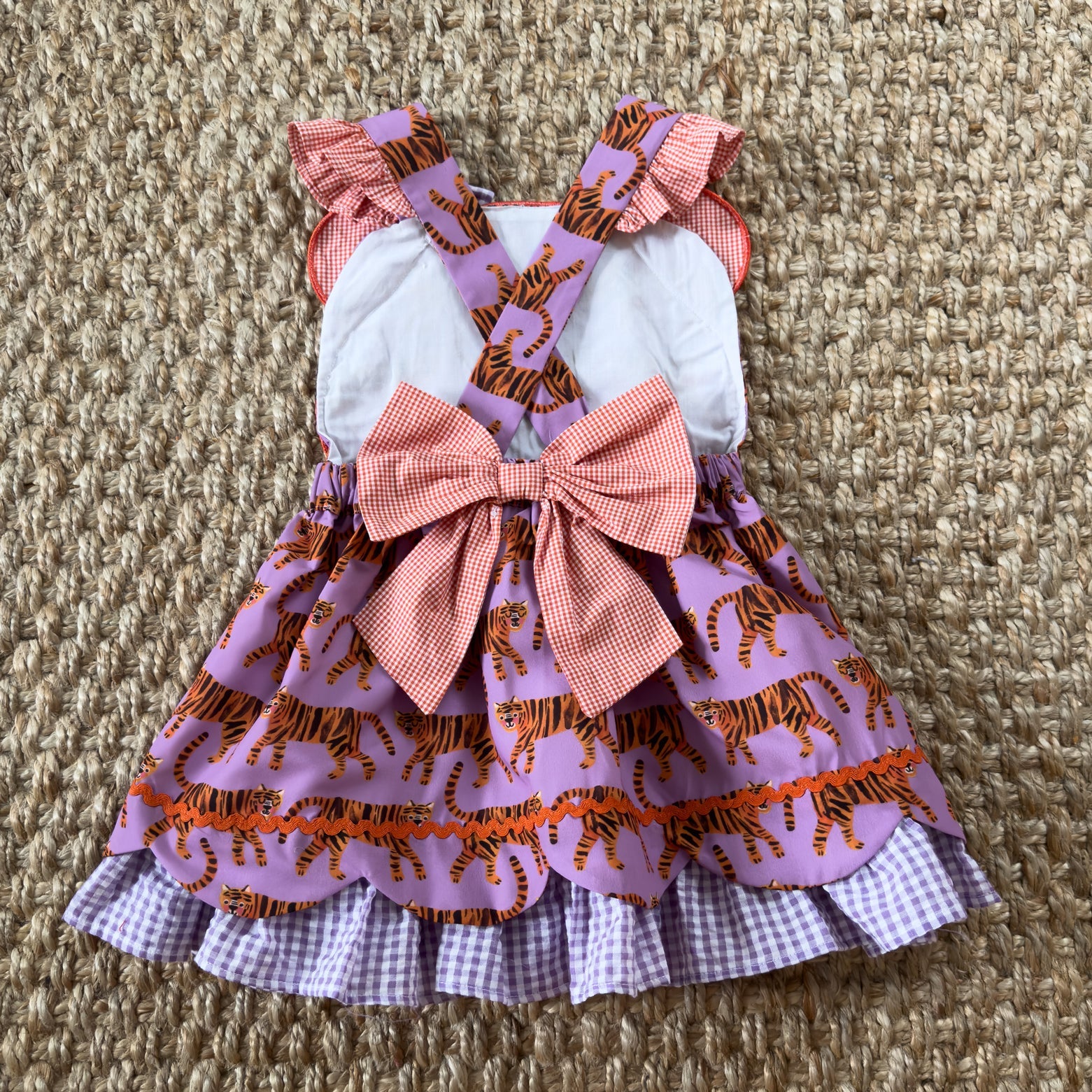 Be GameDay ready for Saturdays in the South with our Orange & Purple Tiger Dress. This dress features our custom designed Tiger GameDay print by the talented Katherine Herrell Studio. Adjustable criss-cross straps button in the back. Double layer skirt with scallop hemline and ruffle detail.