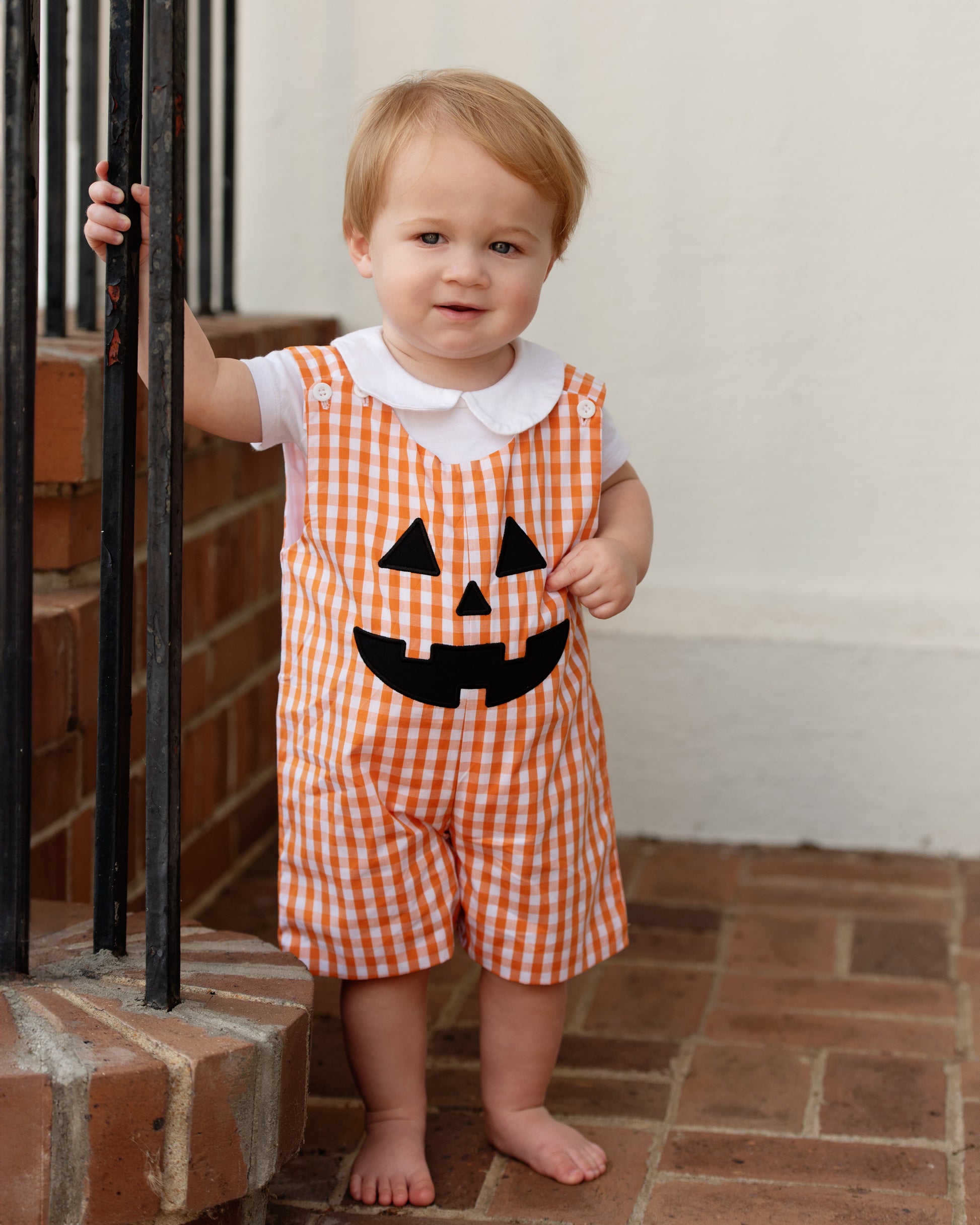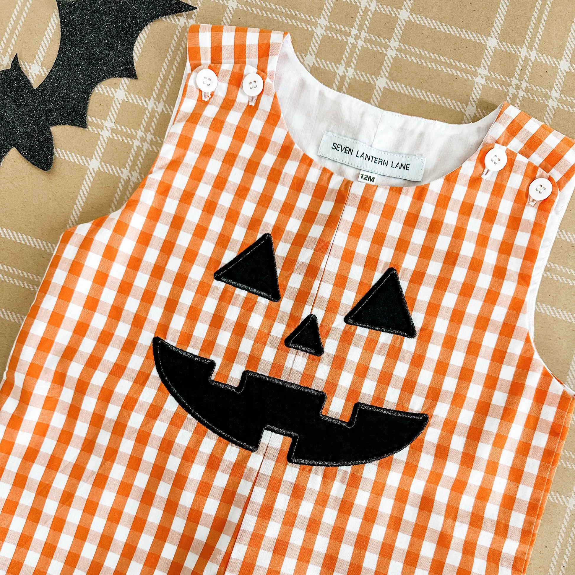 Get your little one ready for Halloween with this charming boys' orange gingham Jon Jon, featuring a delightful pumpkin face appliqué!
