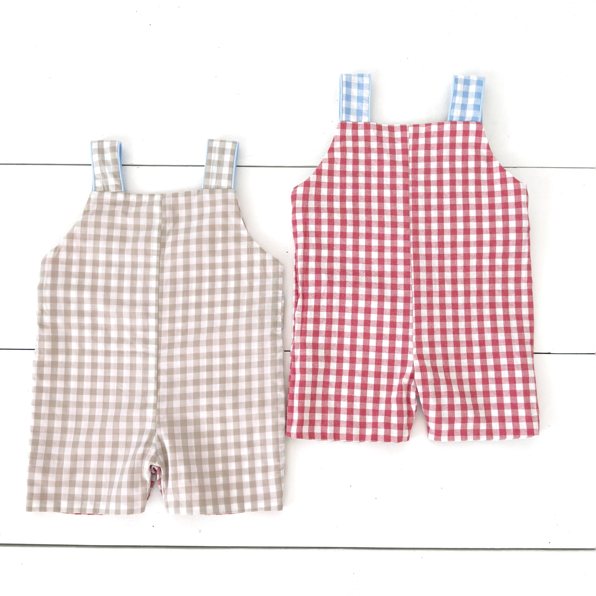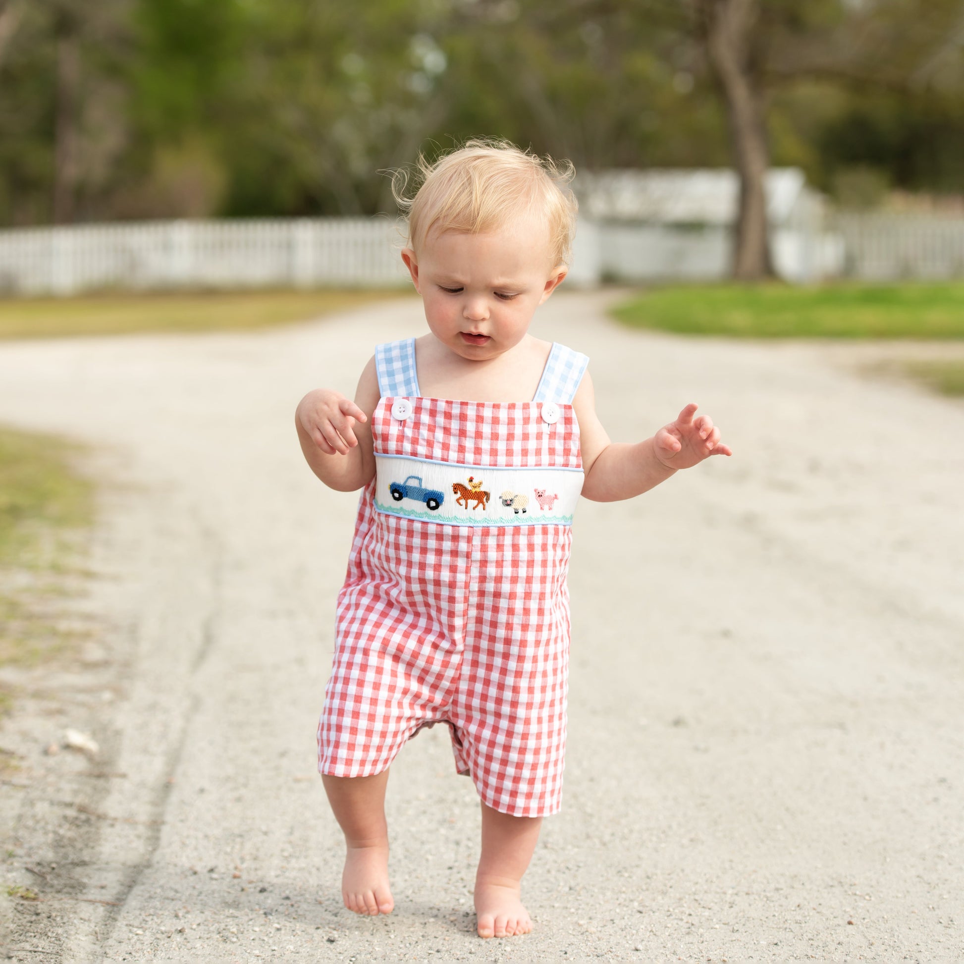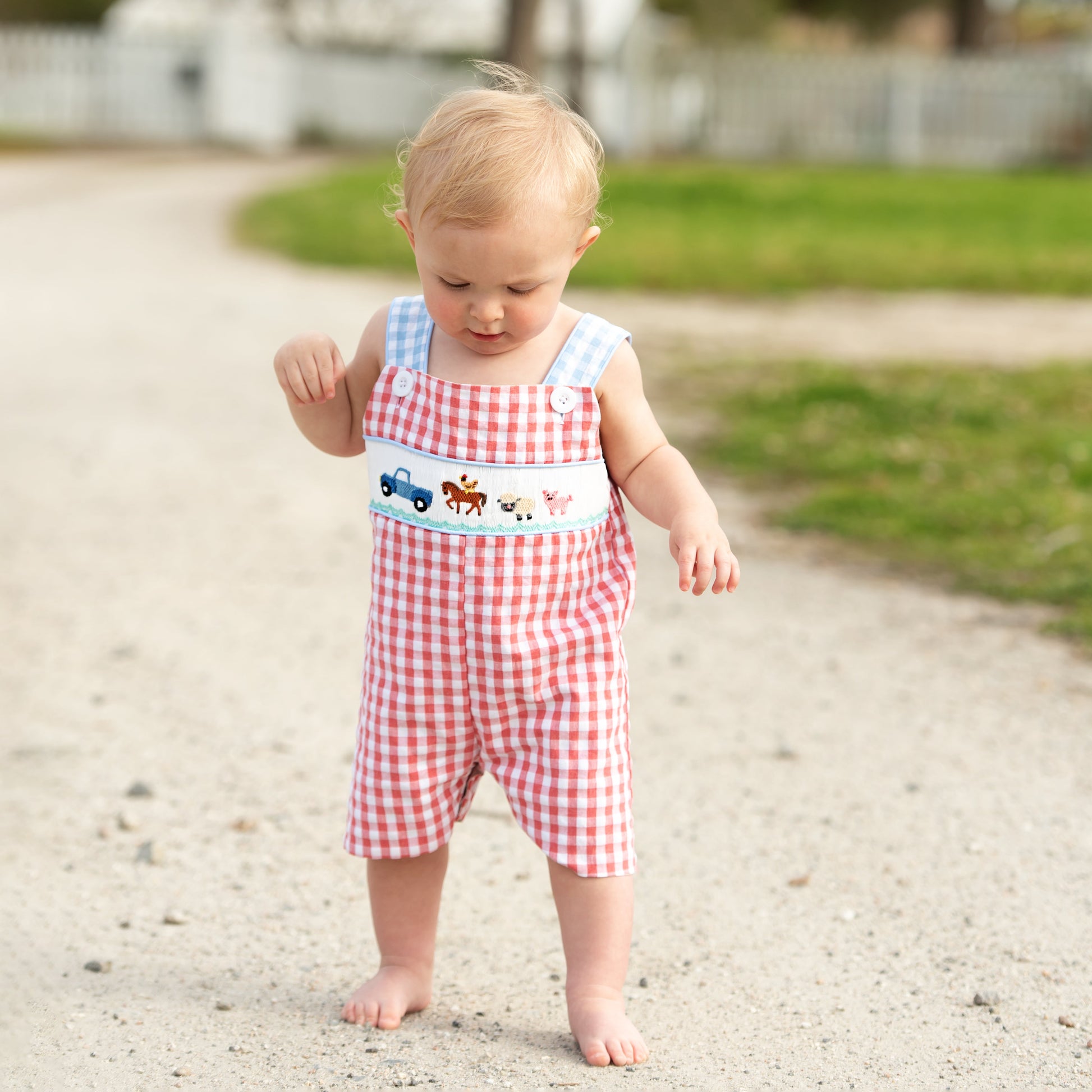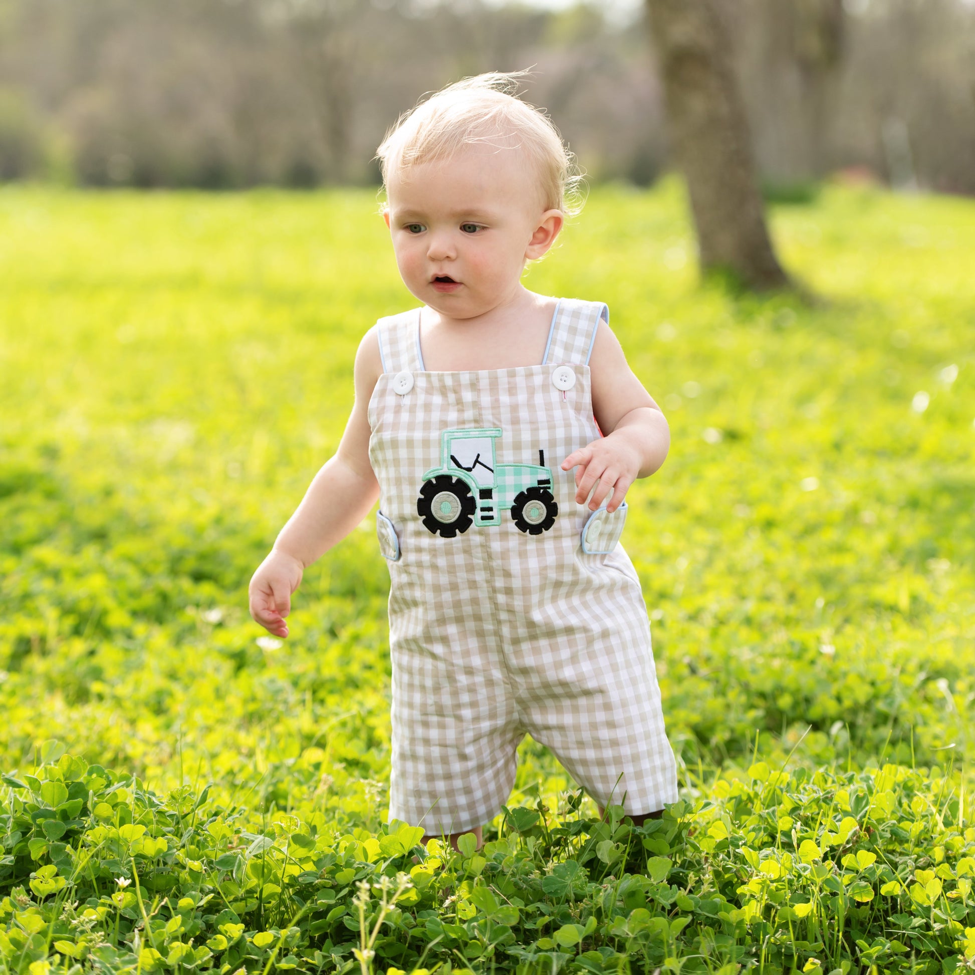 Two outfits in one! The Reversible Tractor / Farm Jon Jon features a mint tractor applique on khaki check. The Jon Jon reverses to a smocked little blue truck and farm animals.