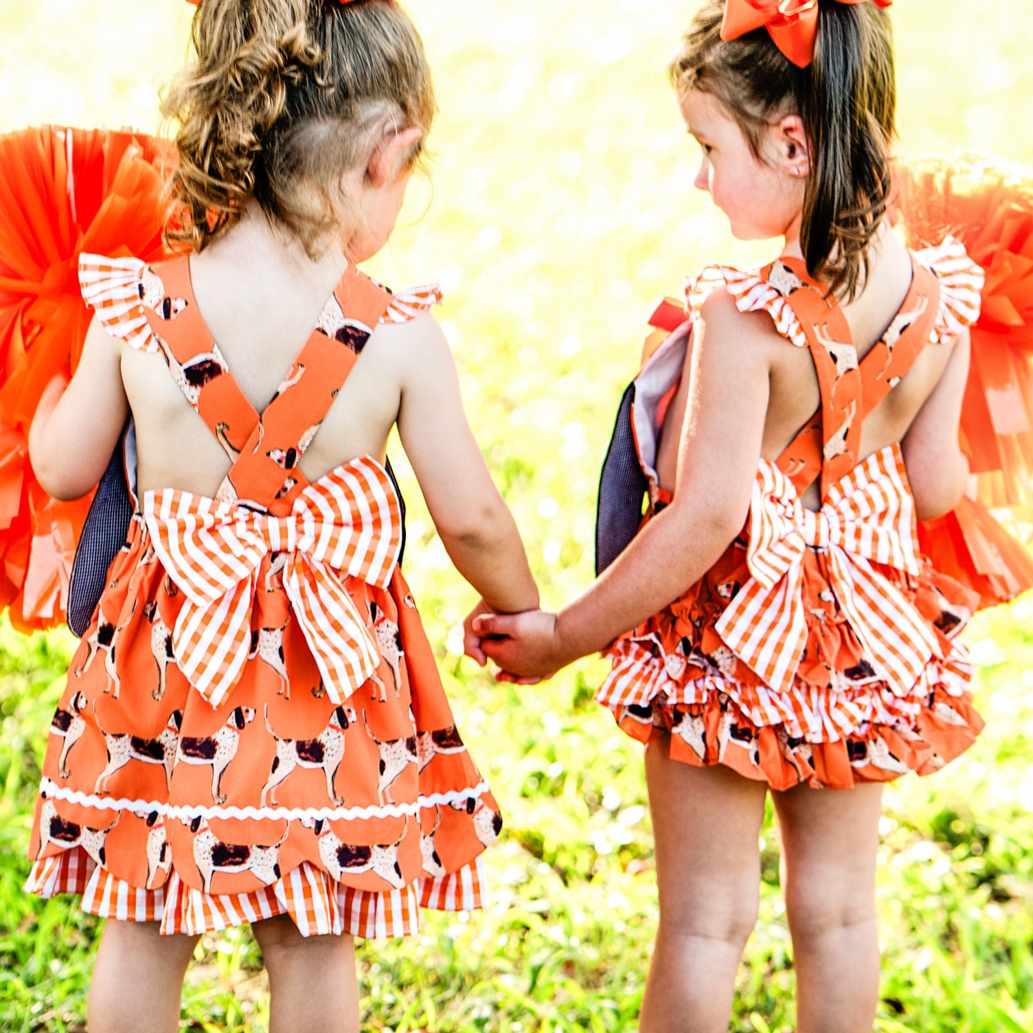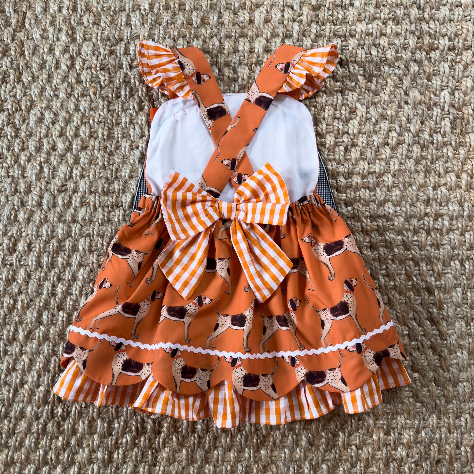 Be GameDay ready for Saturdays in the South with our Rocky Top Coonhound Dress. This dress features our custom designed Coonhound GameDay print by the talented Katherine Herrell Studio. Adjustable criss-cross straps button in the back. Double layer pettiskirt with scallop hemline and ruffle detail.