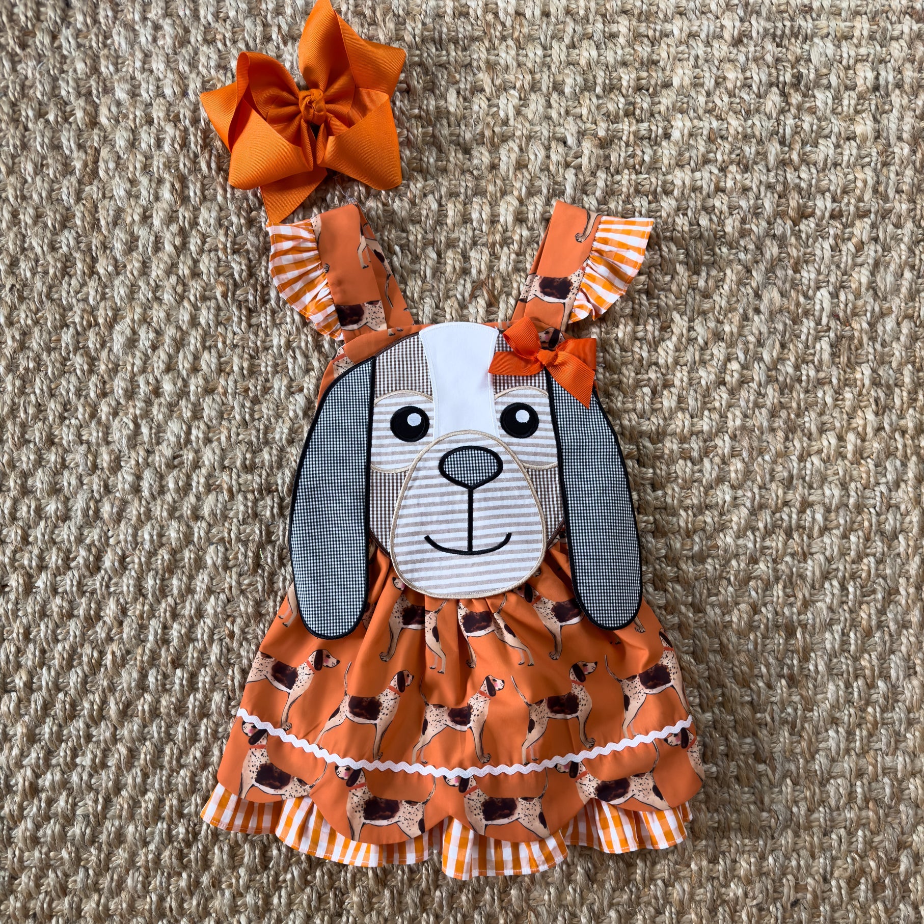 - oversize applique coonhound on chest with real bow