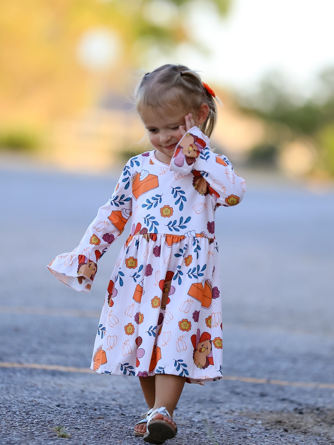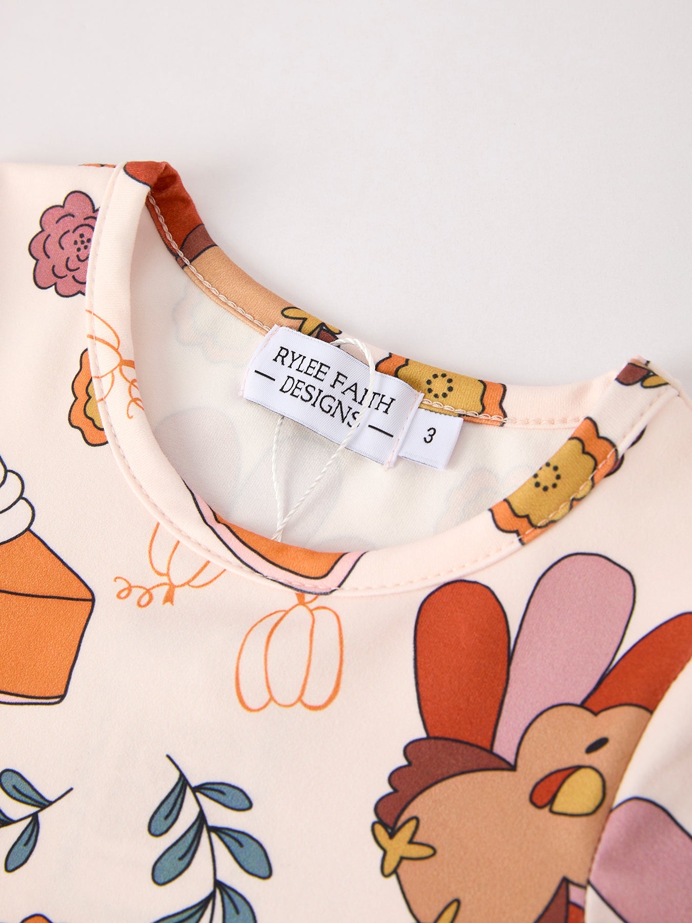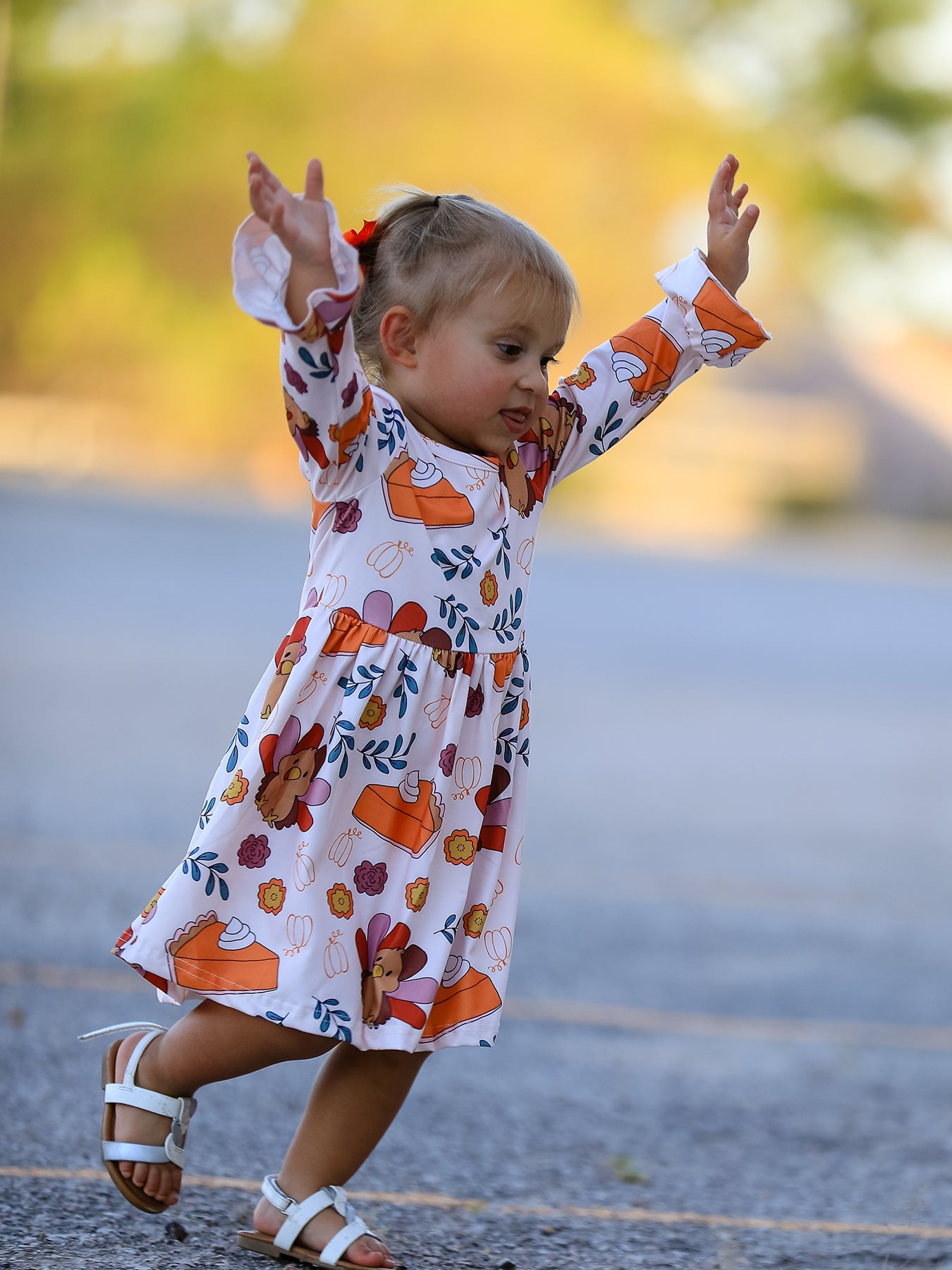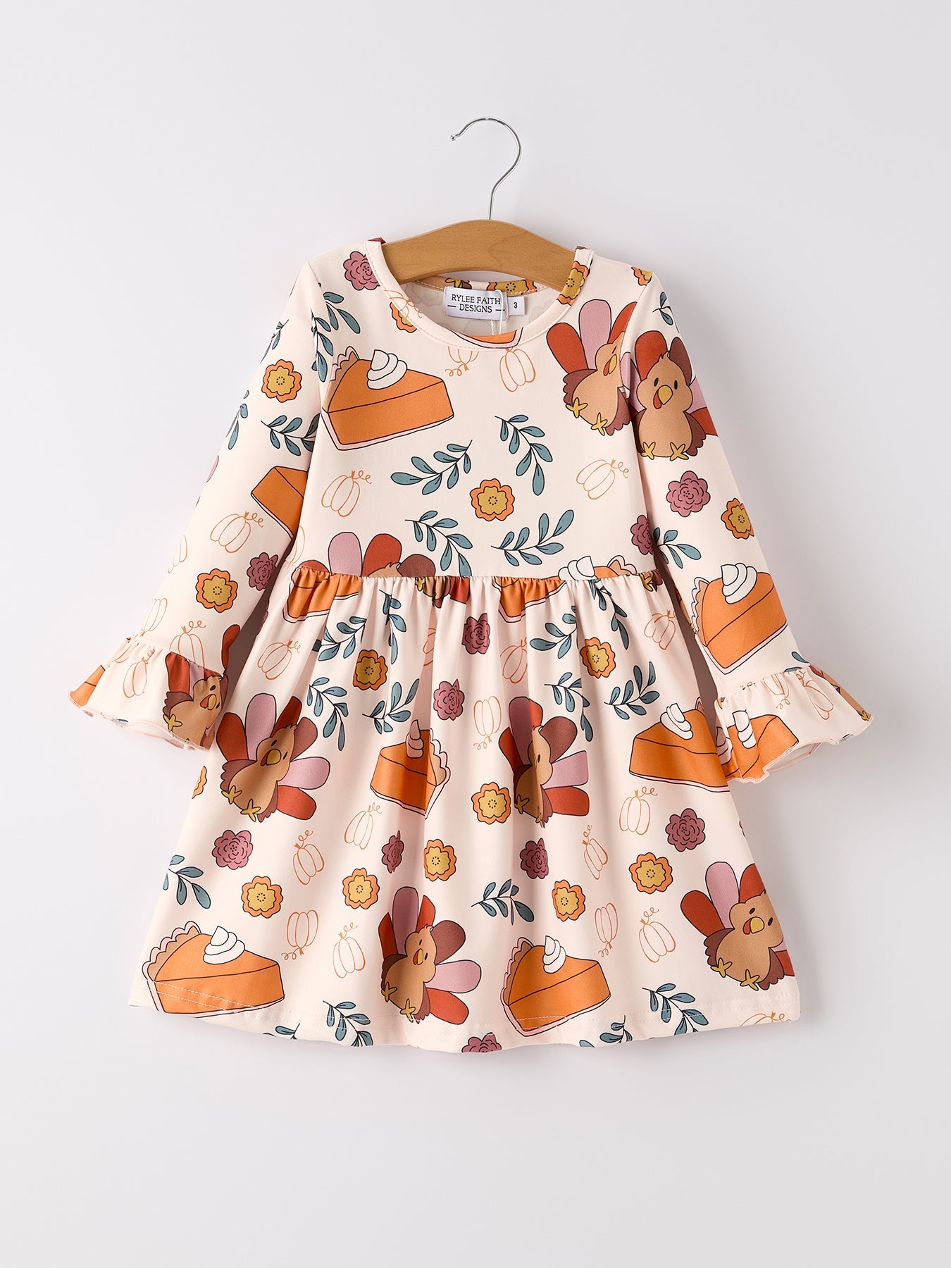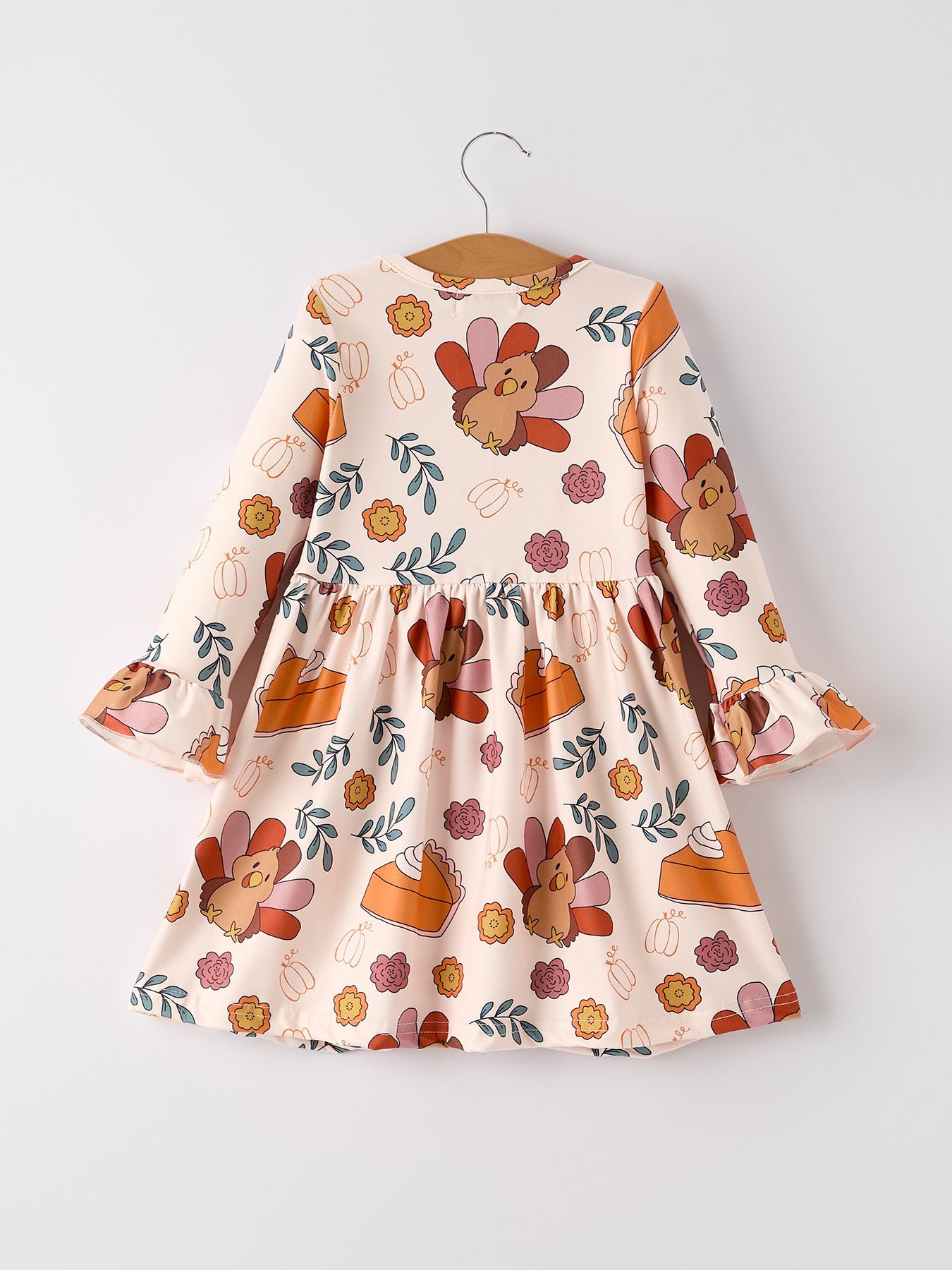 Indulge in the festive spirit with this adorable Thanksgiving dress! Featuring a charming turkey and pie print design, your little girl will steal the show. Made with soft and comfortable fabric, this dress is perfect for family gatherings, school events, and festive photos.