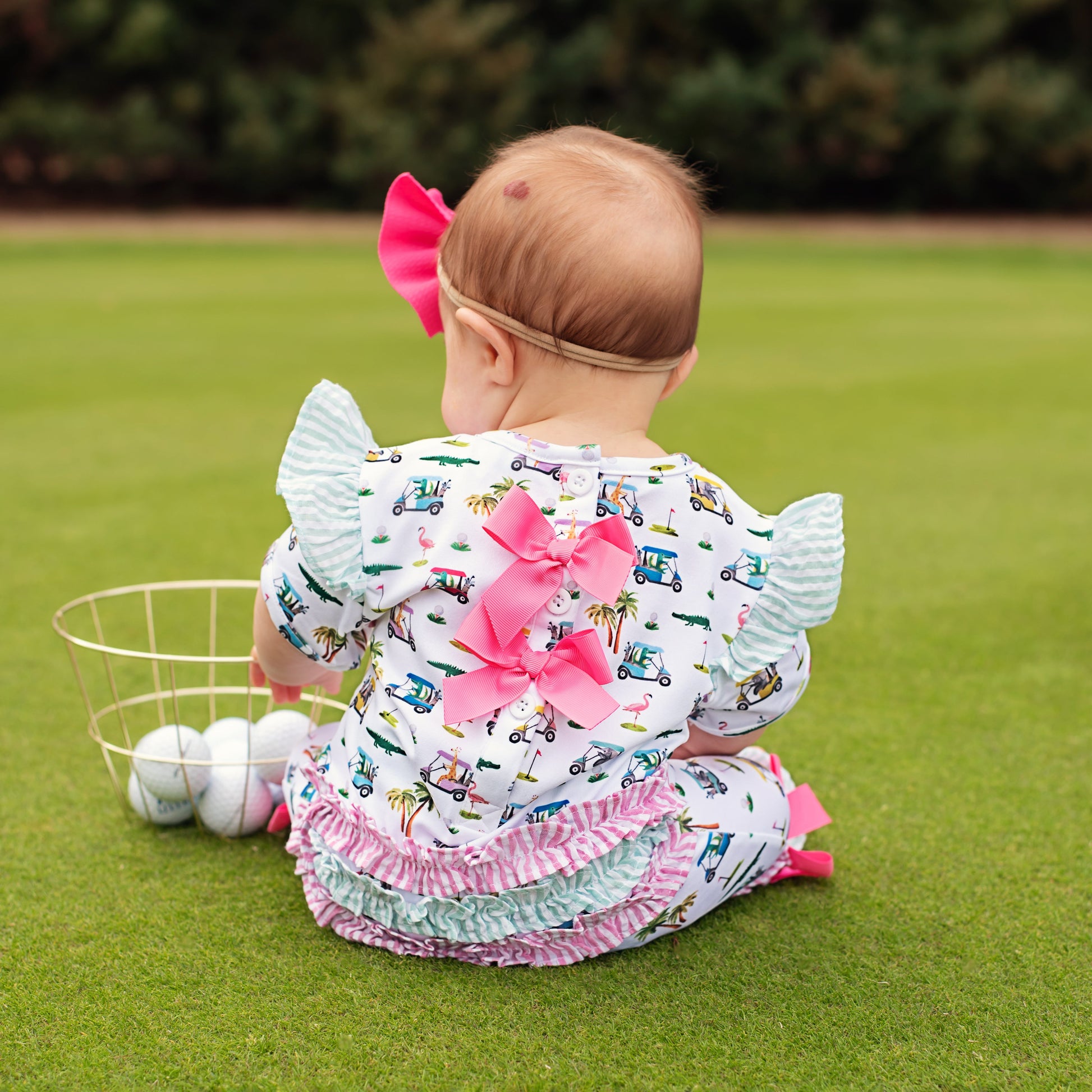 The Palms Girls Golf Romper was designed in collaboration with the talented Katherine Herrell Studio. Super soft and comfy knit with oodles of seersucker ruffles and grosgrain bows. The Palms Golf Romper is the perfect piece for visiting the country club or watching The Masters.
